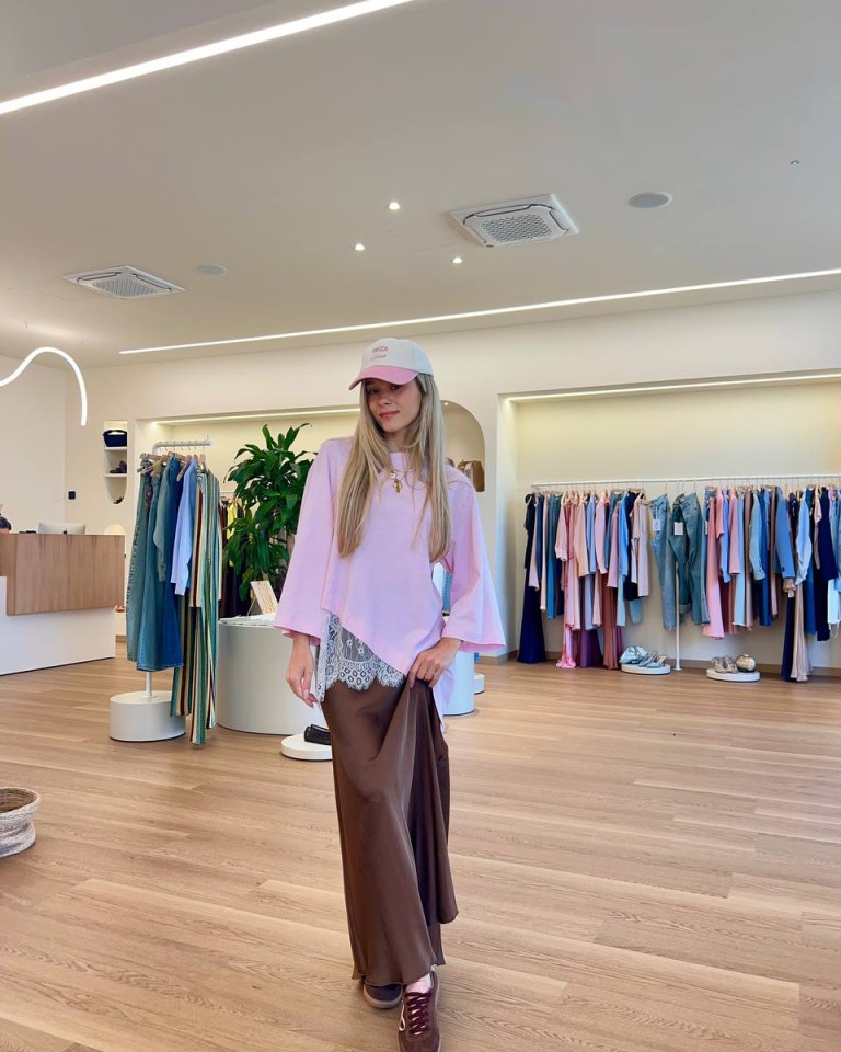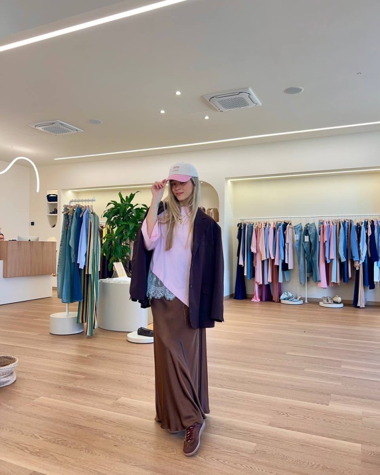 Questo outfit gioca con le sovrapposizioni e i volumi, combinando t-shirt rosa oversize con una giacca più strutturata sopra. La gonna lunga marrone, fluida e morbida nei movimenti, aggiunge un elemento elegante che bilancia l’aspetto sportivo del look. Il cappellino completa l’insieme con un tocco urbano e disinvolto. È un outfit contemporaneo, perfetto per chi ama mescolare capi casual e dettagli più sofisticati.