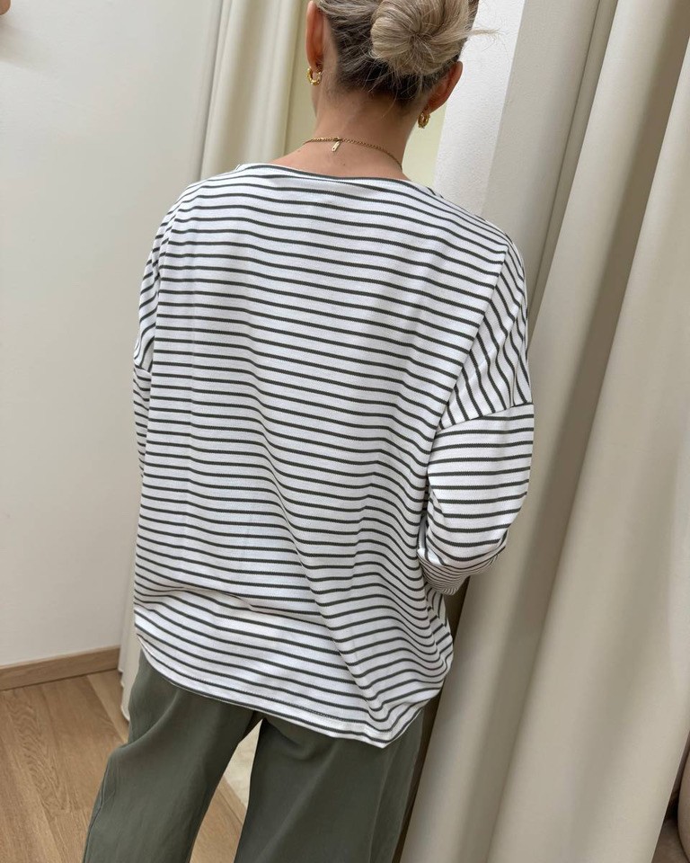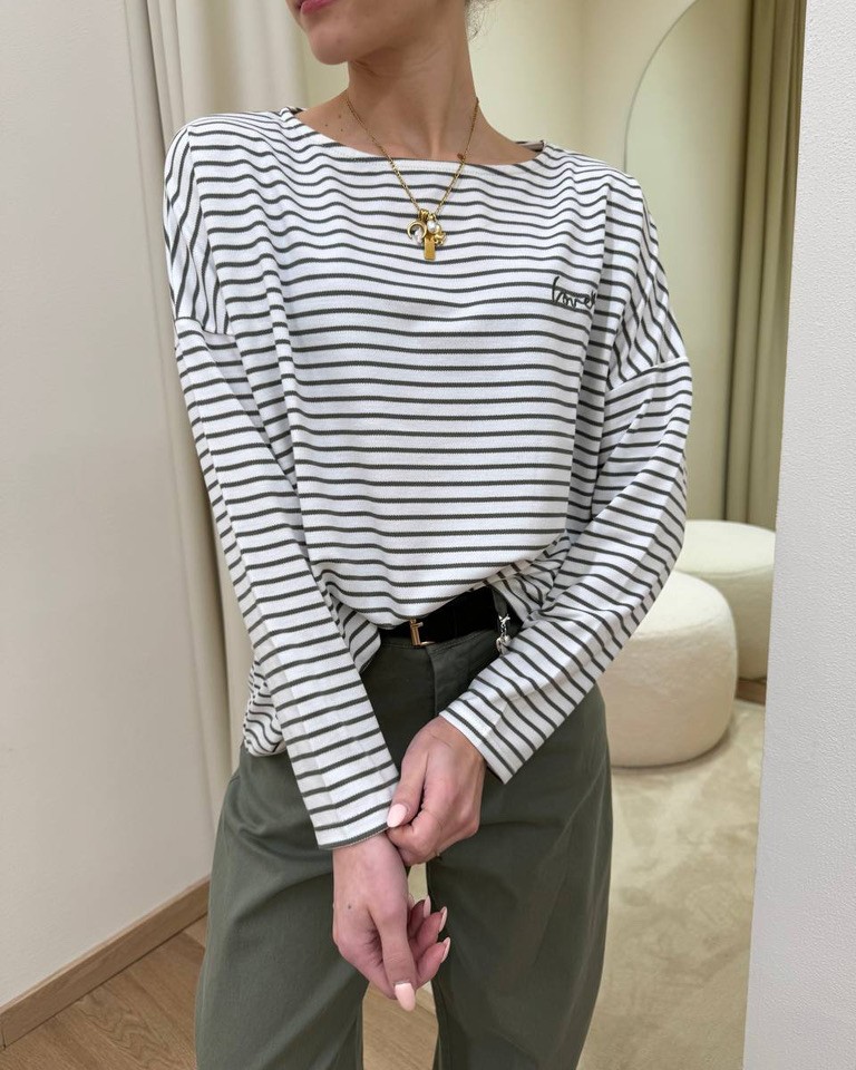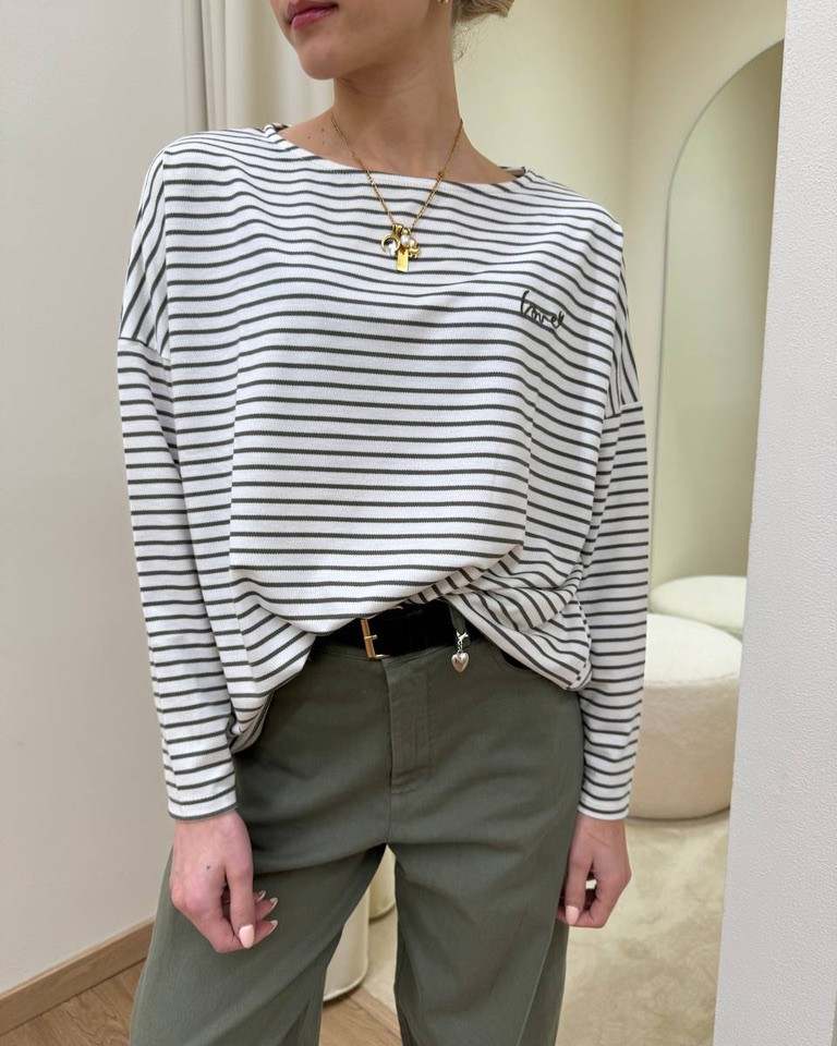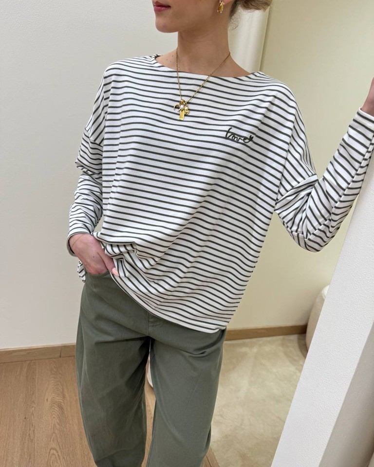 Maglia bianca a righe verde salvia con ricamo “love” in corsivo sul petto, modello oversize, a scatoletta scollo a barchetta, giro sceso e maniche lunghe. Vestibilità ampia.