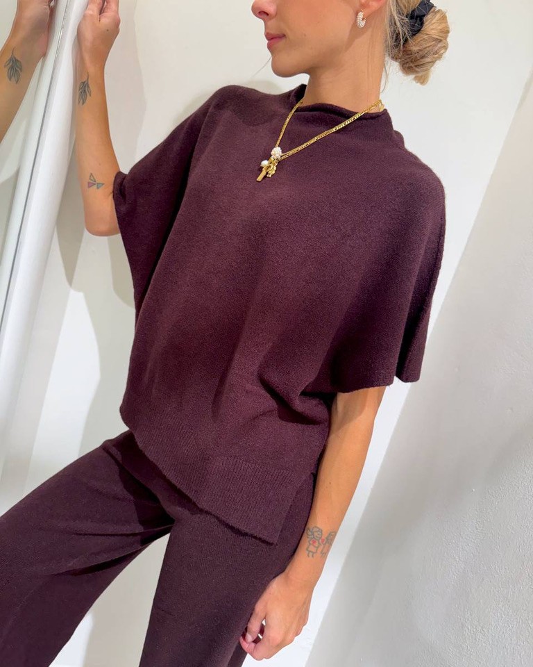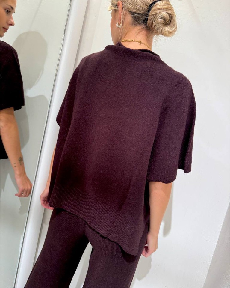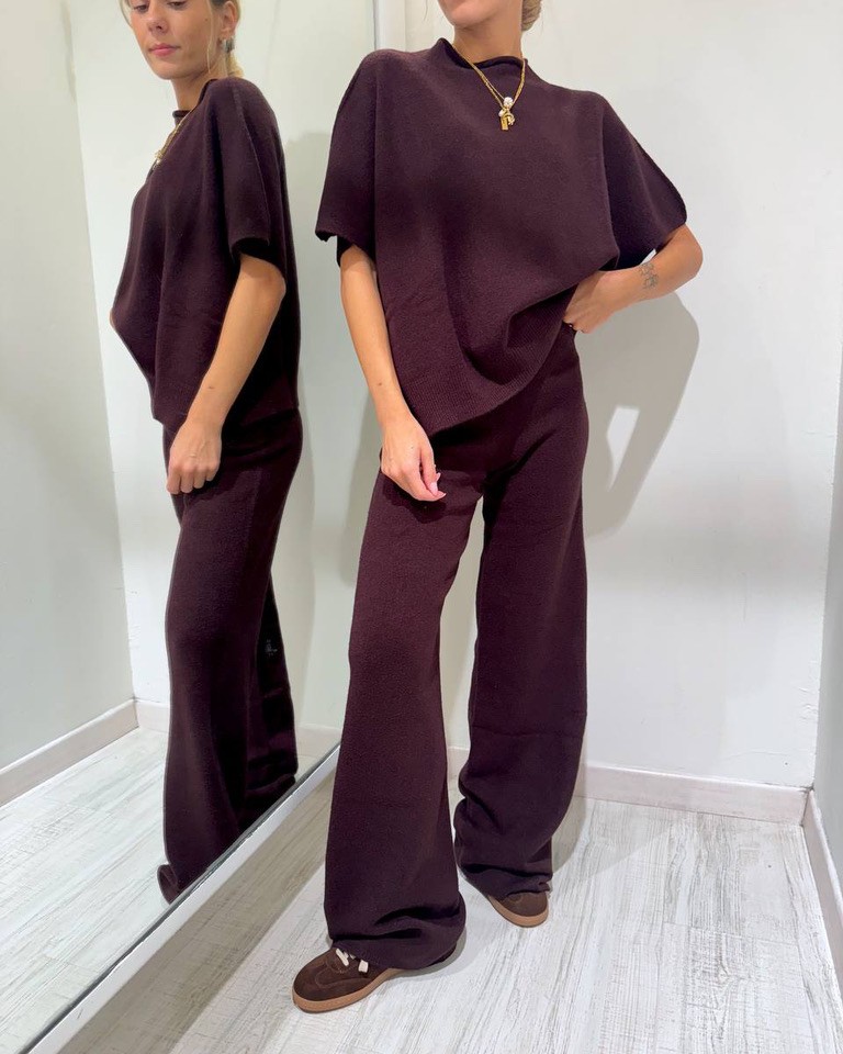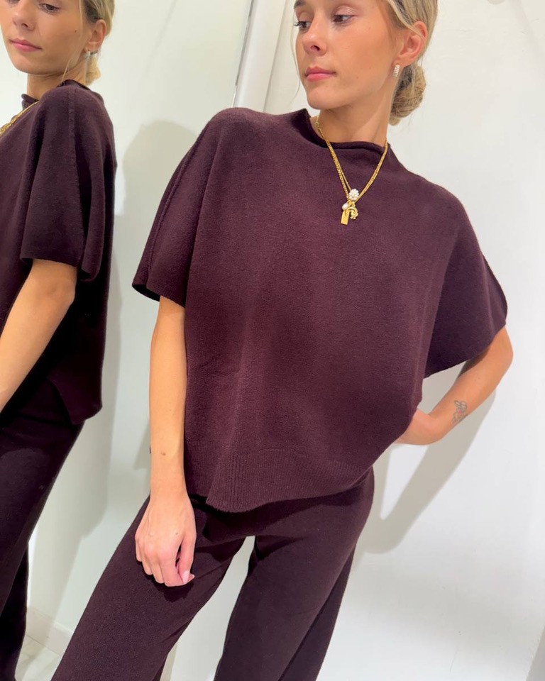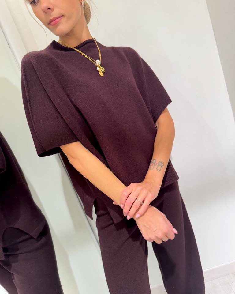 Maglia moro in viscosa, modello collo cratere con rotolino, con mezze maniche a pipistrello. Spacchetti laterali con elastico alto a coste sul fondo.Vestibilità morbida.