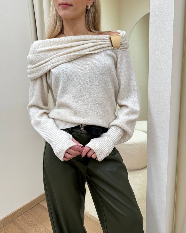 Maglia avorio con lana e viscosa, modello a maniche lunghe con scollatura schiffer rappresa da un dettaglio metallico dorato. costine alte su fondo e maniche. Vestibilità regolare.