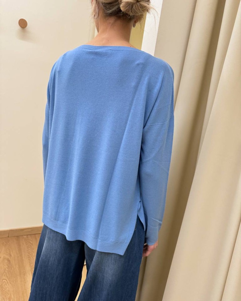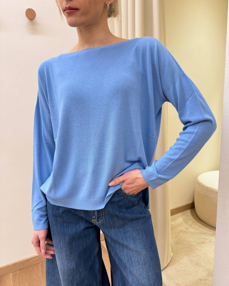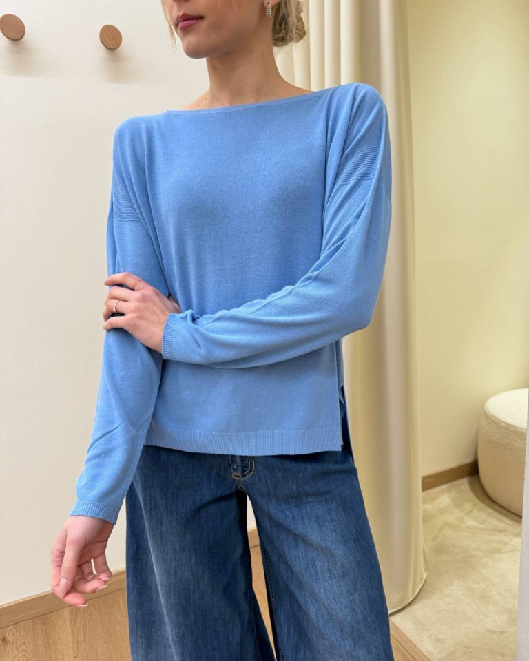 Maglia color denim, modello over a scatoletta, scollo a barca, manica lunga, bordi a costine su scollo, maniche e fondo, spacchetti laterali. Vestibilità ampia.