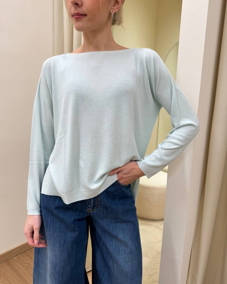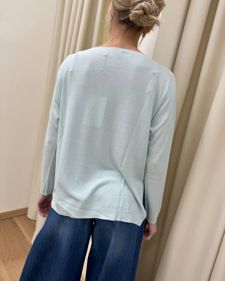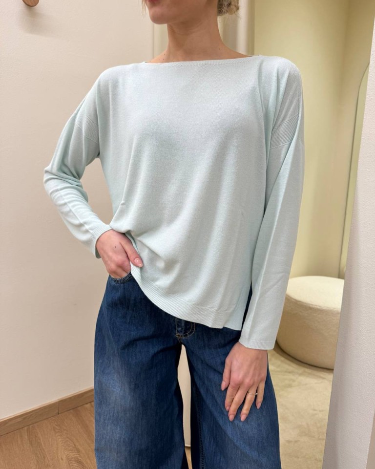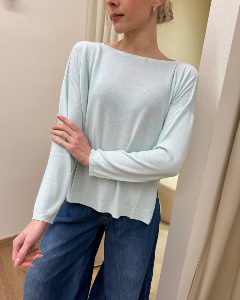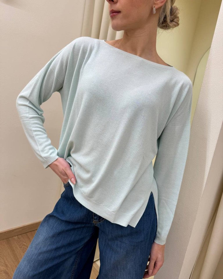 Maglia color menta, modello over a scatoletta, scollo a barca, manica lunga, bordi a costine su scollo, maniche e fondo, spacchetti laterali. Vestibilità ampia.