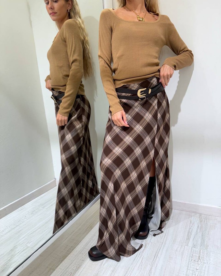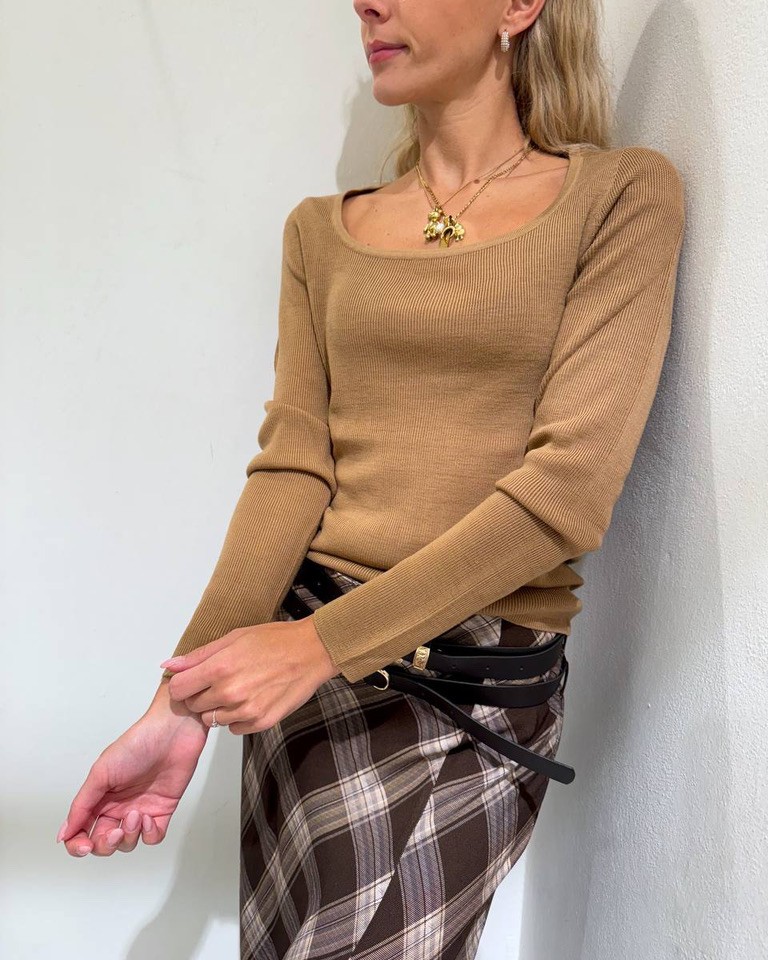 Maglia cammello in viscosa, modello a costine, maniche lunghe con scollo a madonna. Vestibilità aderente ed elasticizzata.