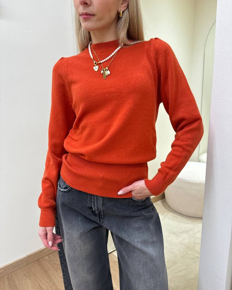Maglia coccio con viscosa, modello girocollo con fascia a coste aderente in vita e maniche arricciate. Vestibilità regolare.