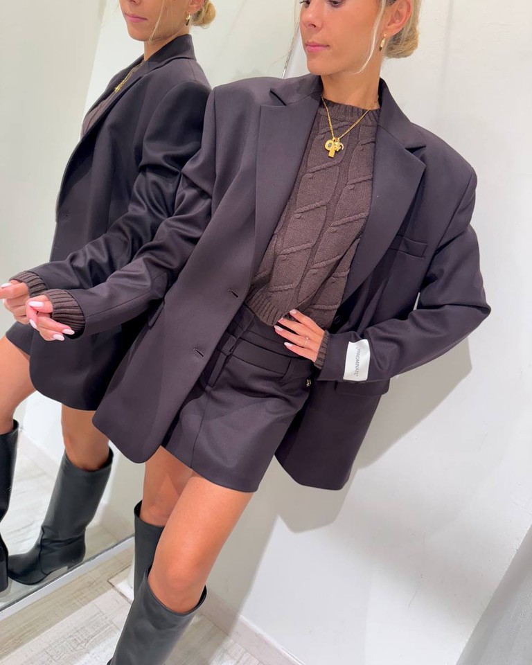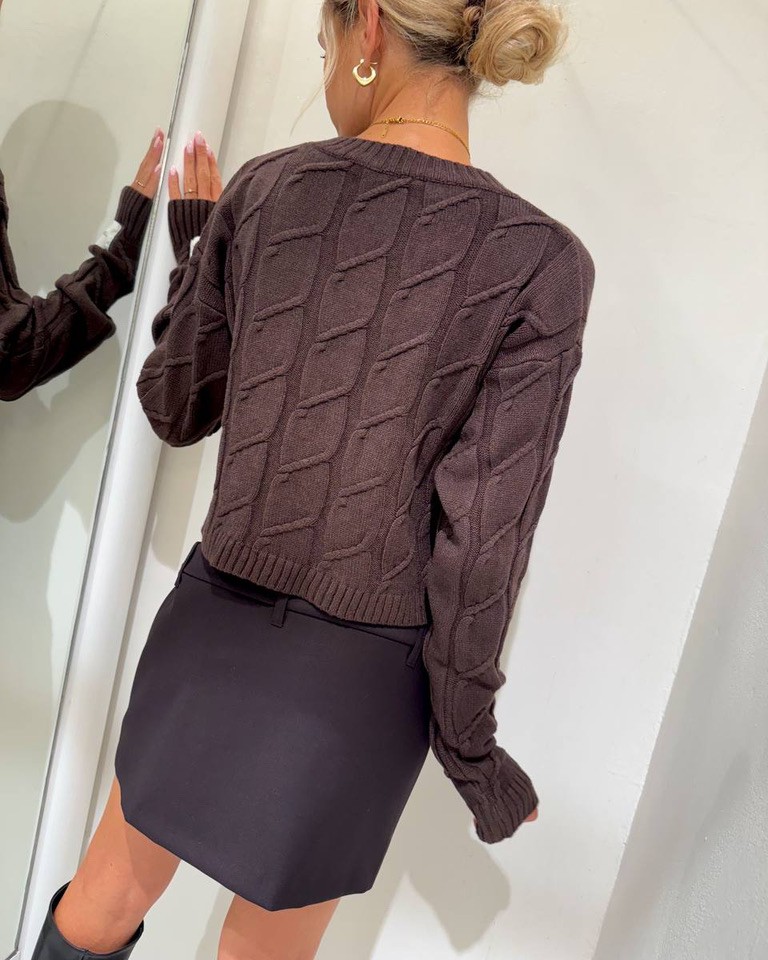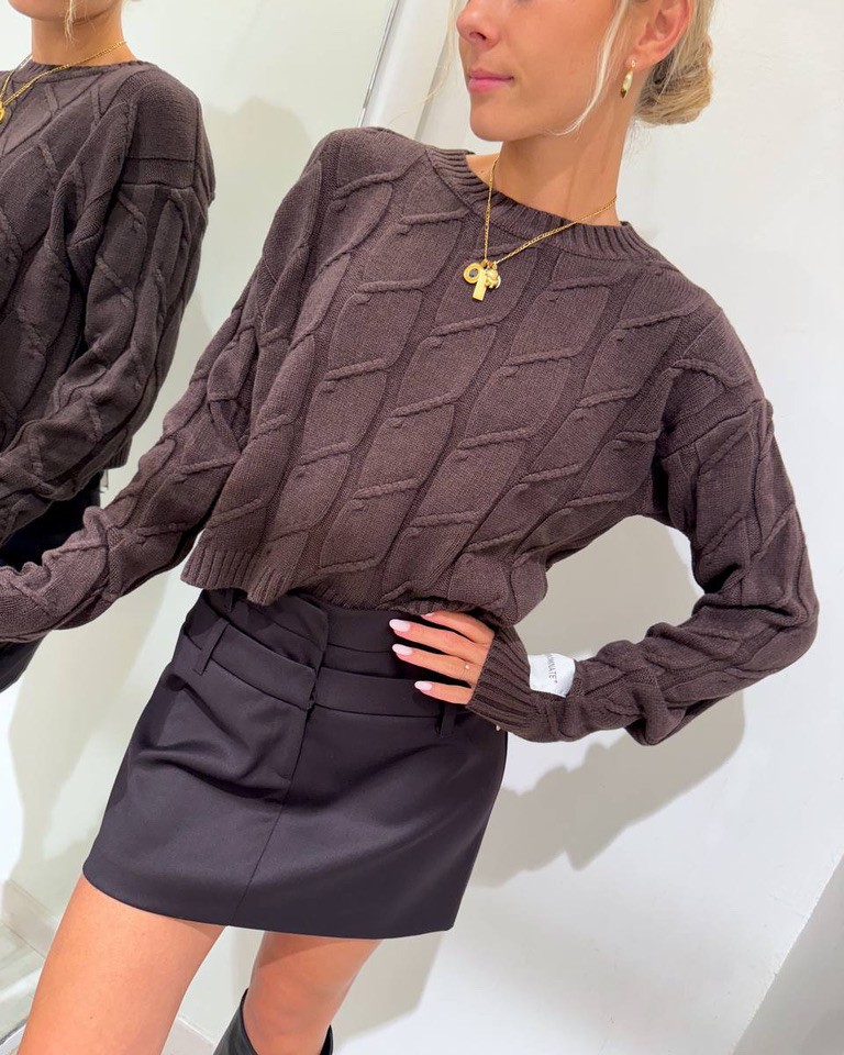 Maglia color moro in viscosa con trecce, modello scatoletta corto, girocollo e maniche lunghe scese. Elastico sui profili a coste. Vestibilità corta.