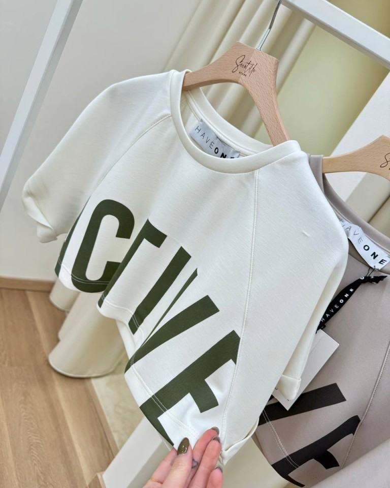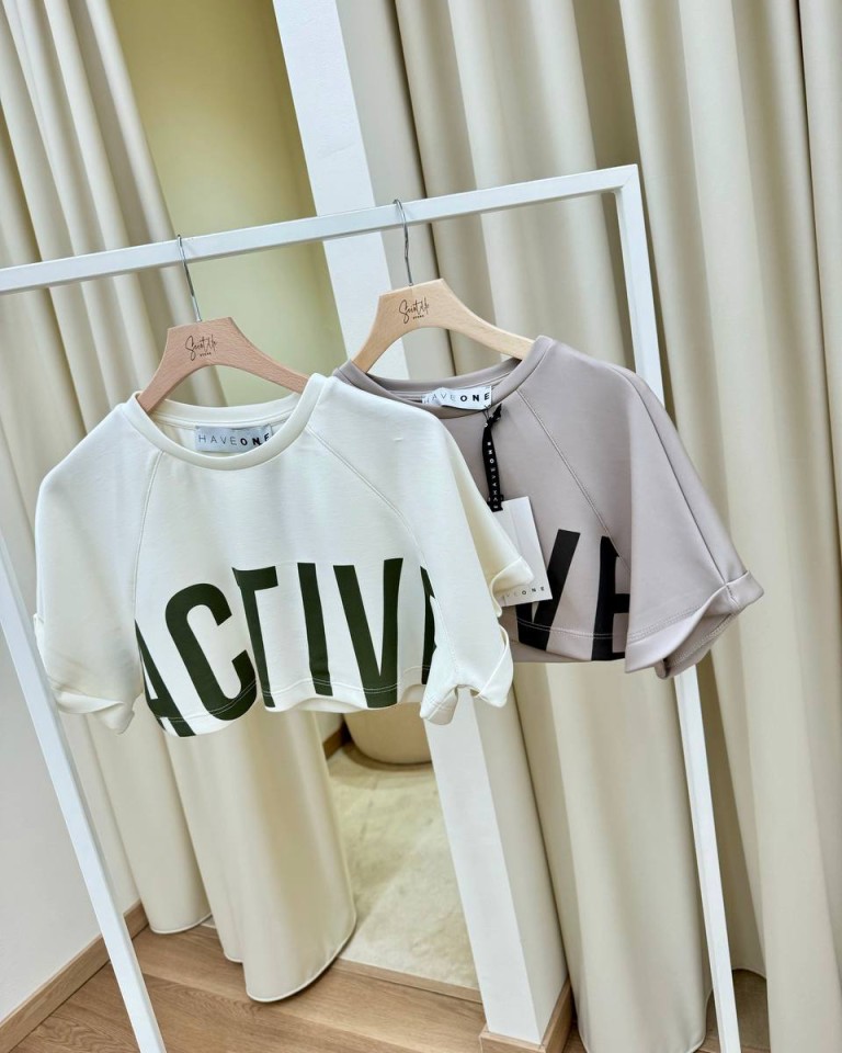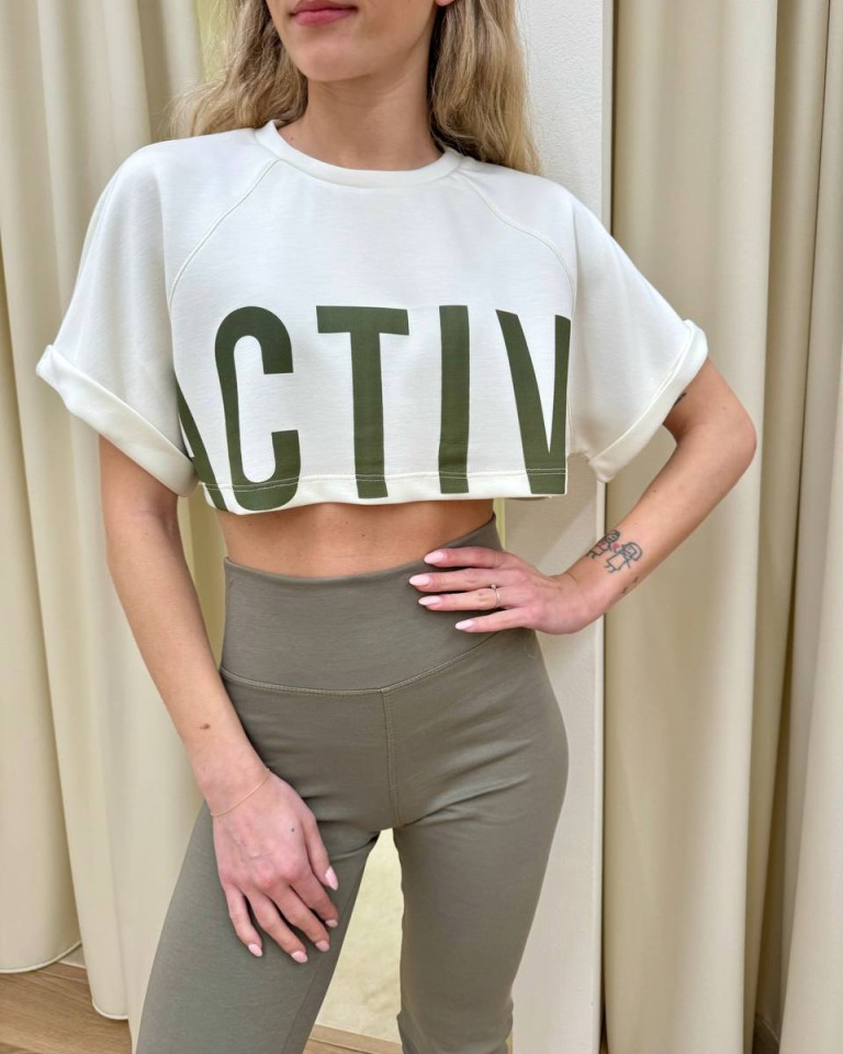 Maglia panna stampa scritta “Active” color verde, modello crop, manica corta raglan e girocollo. Vestibilità ampia.