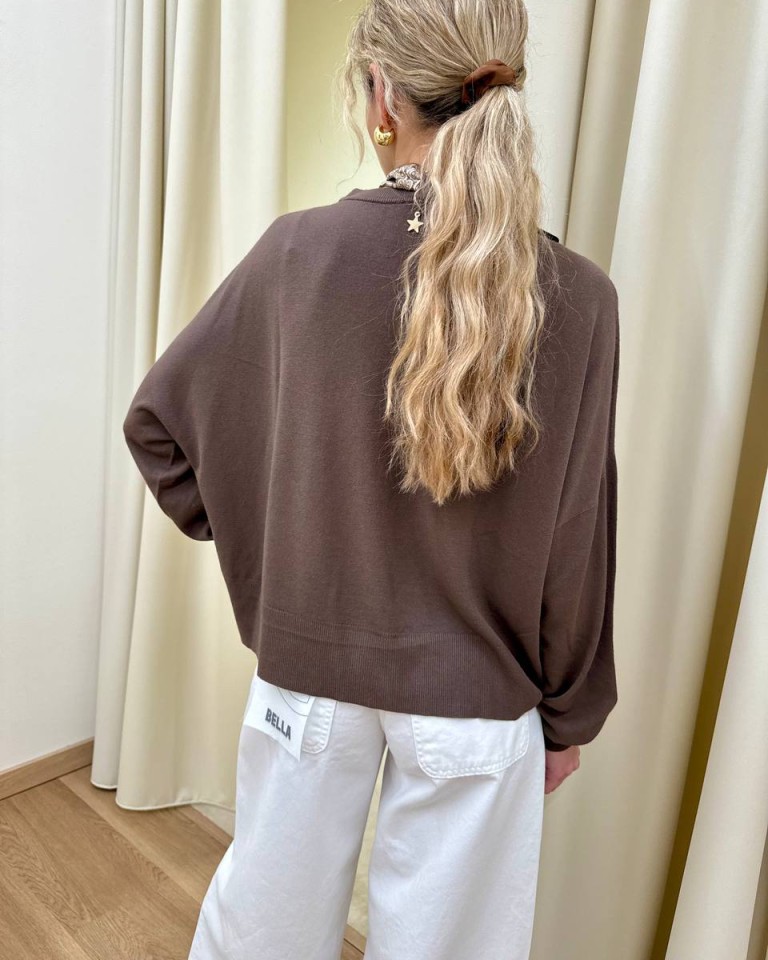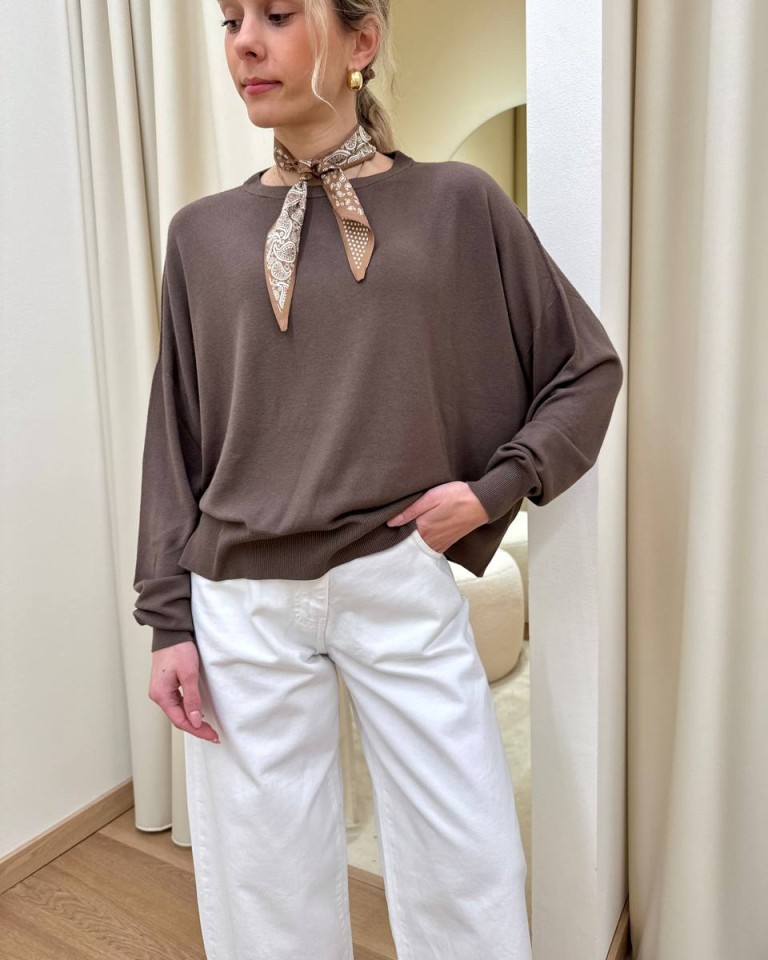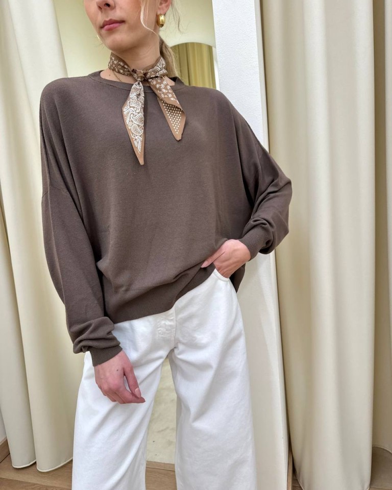 Maglia fango con foulard abbinato rimovibile, modello over girocollo, maniche lunghe con giro sceso, fondo e polsi a costine. Vestibilità ampia.