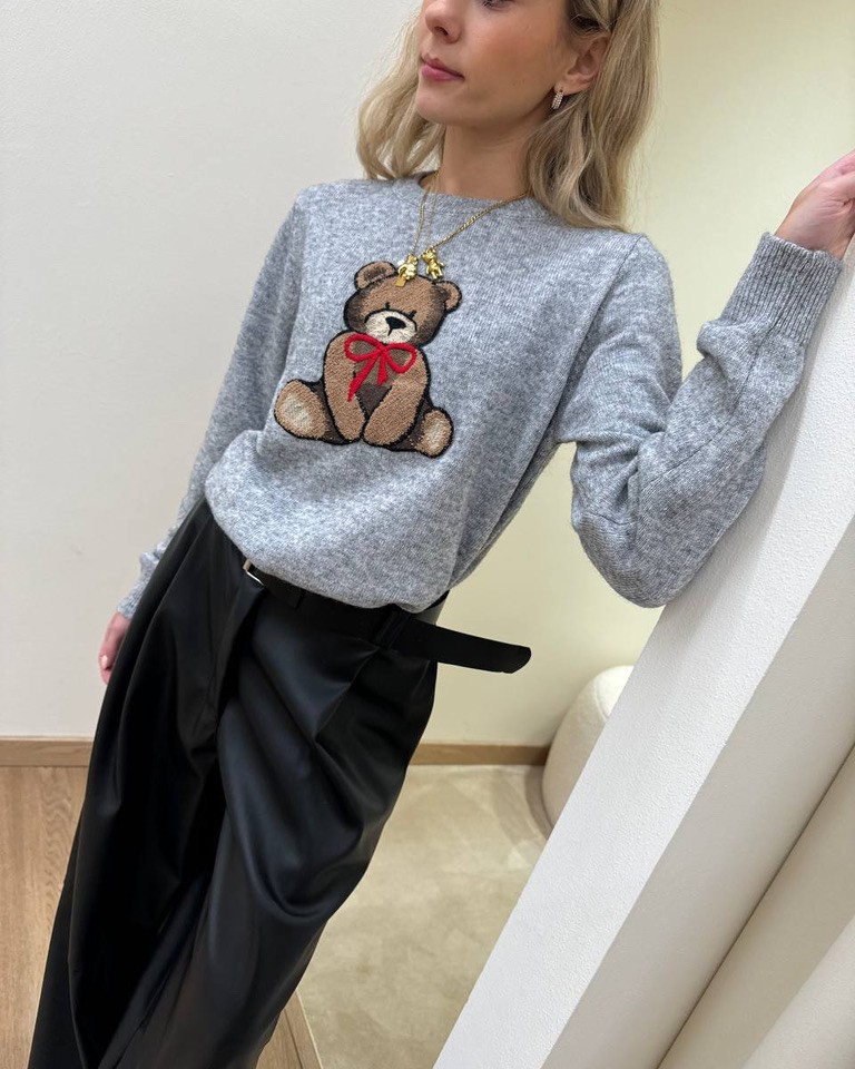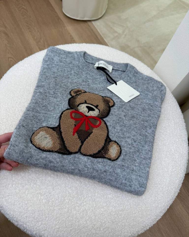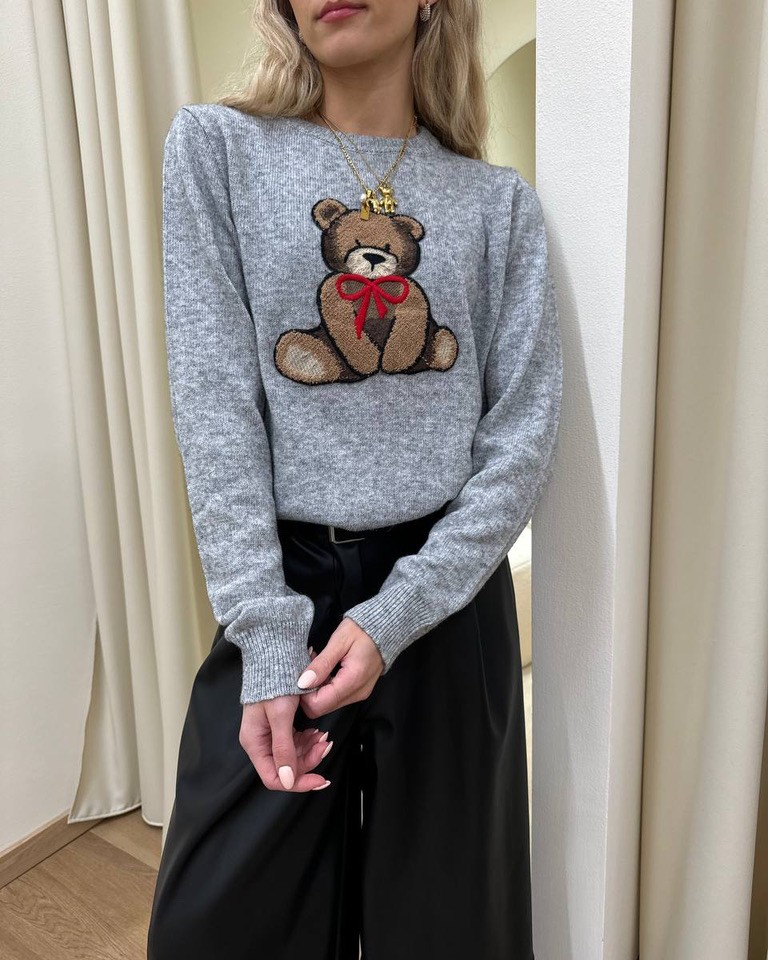 Maglia grigia con viscosa, lana e cachemire, modello girocollo, maniche lunghe e patch sul davanti orsetto. Elastici a coste sui profili. Vestibilità regolare.