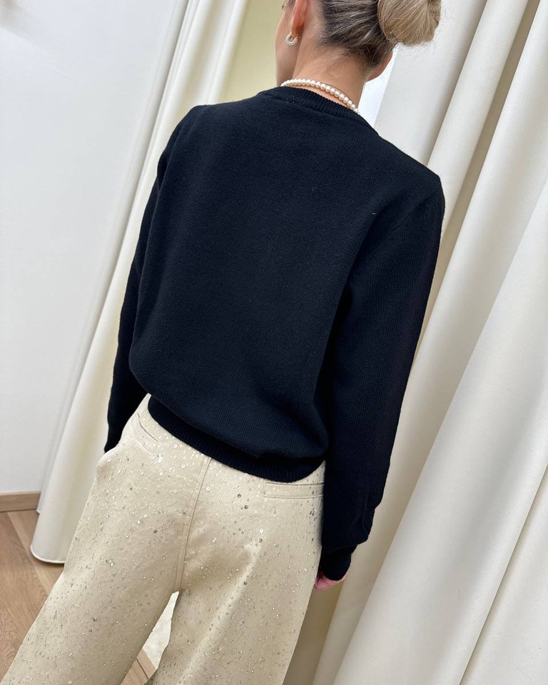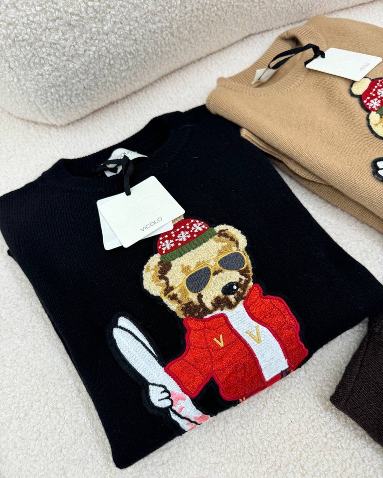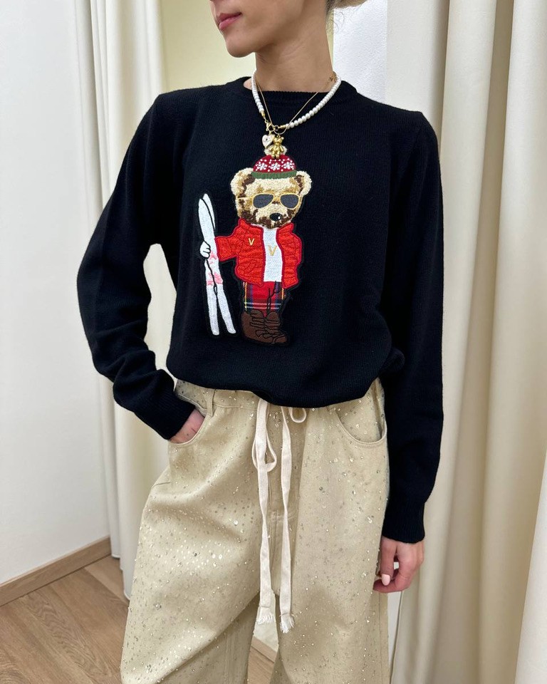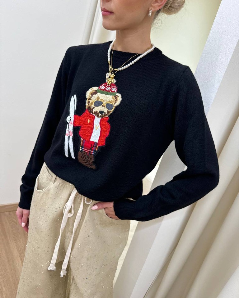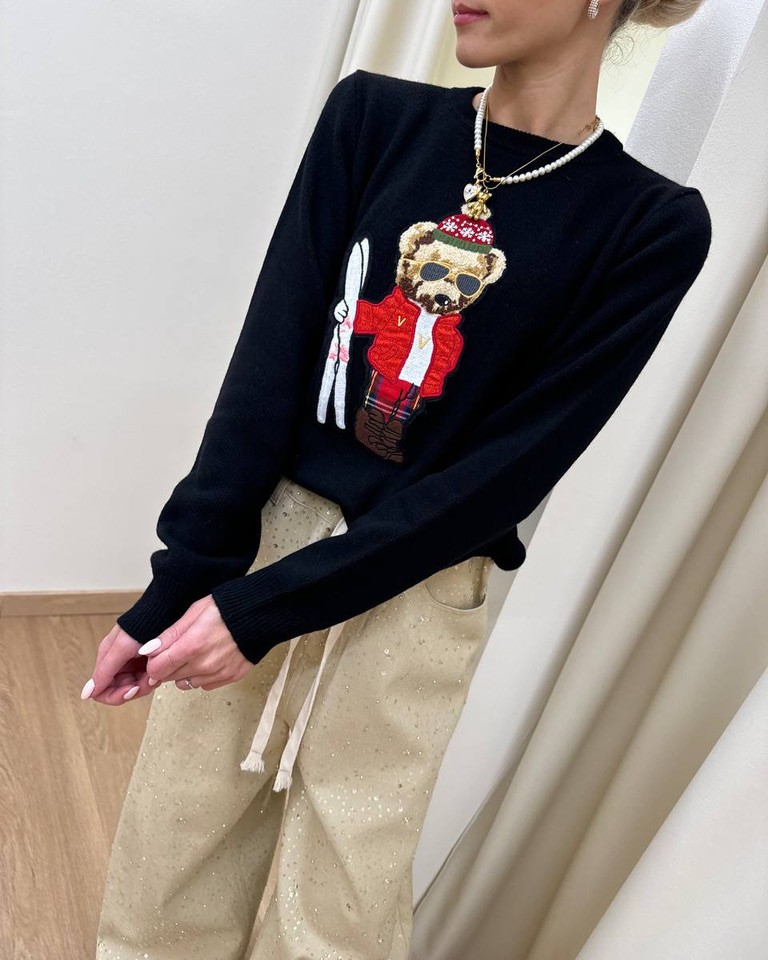 Maglia nera girocollo, con patch orsetto natalizio con scii sul davanti. Modello con fondo polsi e collo a coste elasticizzati, con viscosa, lana e cachemire.