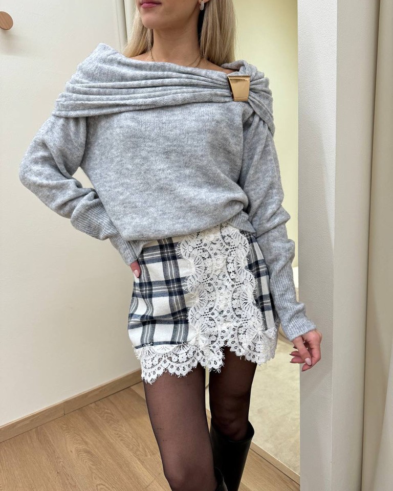 Maglia grigia con lana e viscosa, modello a maniche lunghe con scollatura schiffer rappresa da un dettaglio metallico dorato. costine alte su fondo e maniche. Vestibilità regolare.