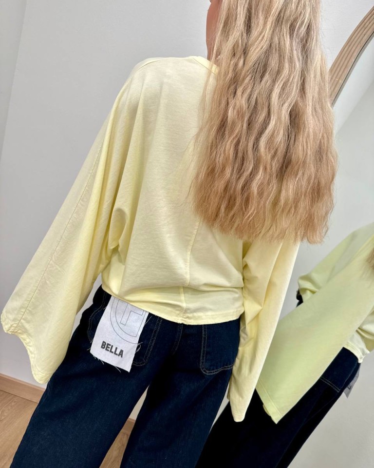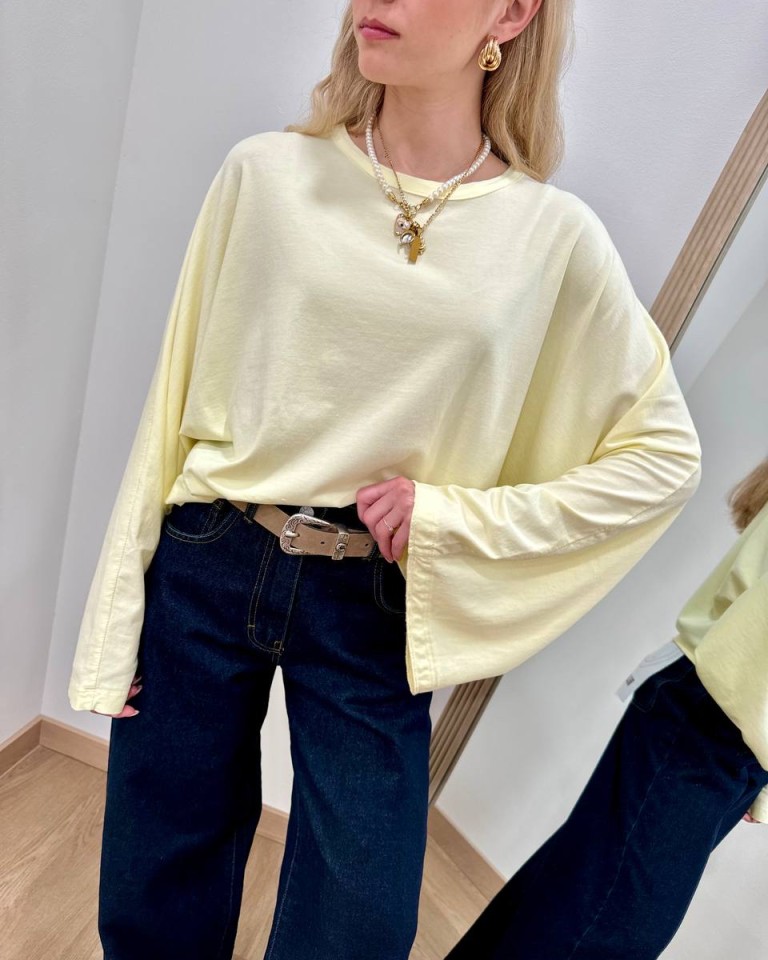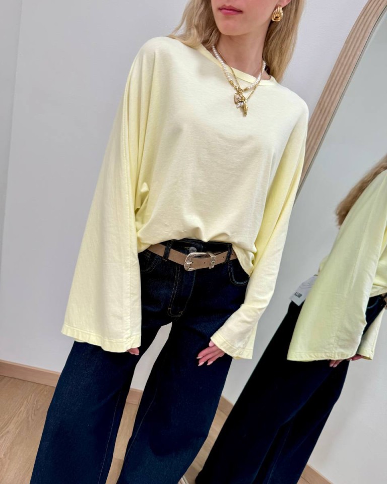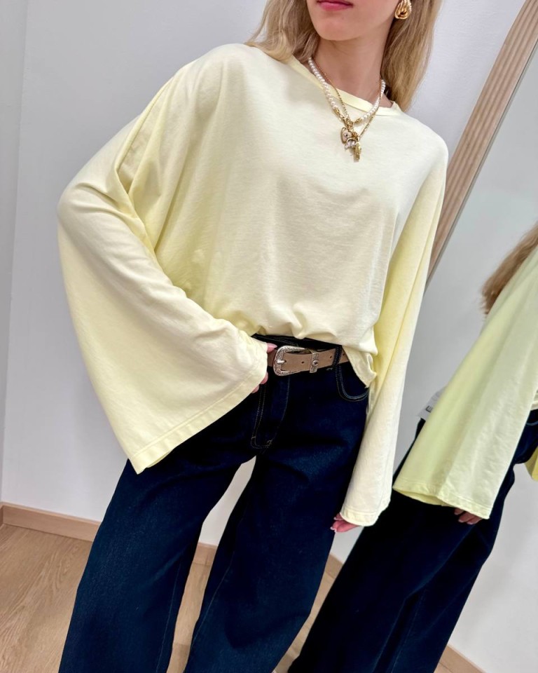 Maglia color giallo pastello, modello over, girocollo con maniche a pipistrello lunghe e ampissime. Vestibilità ampia.