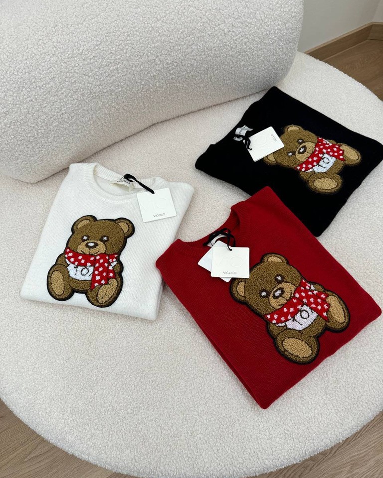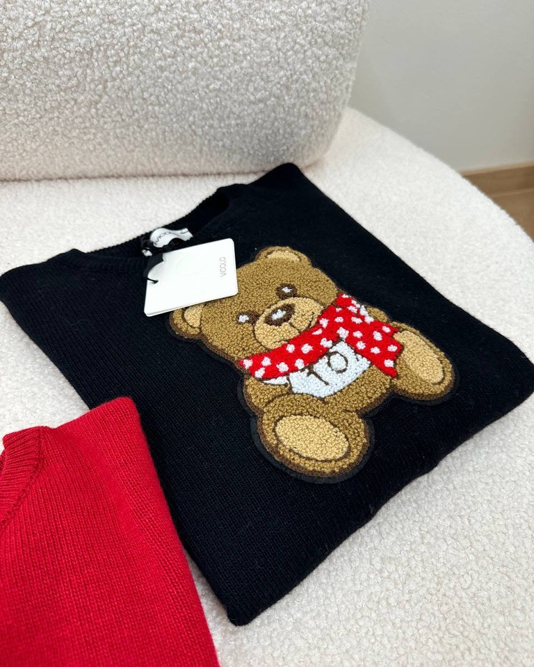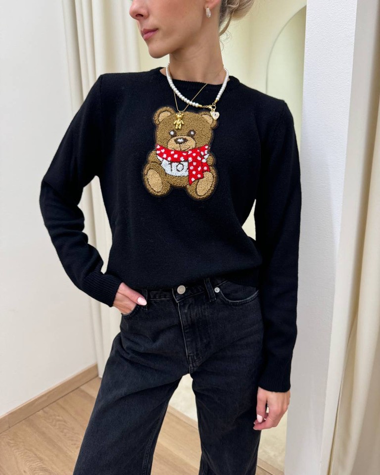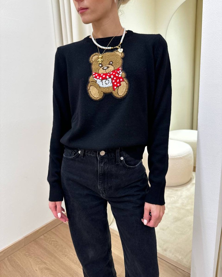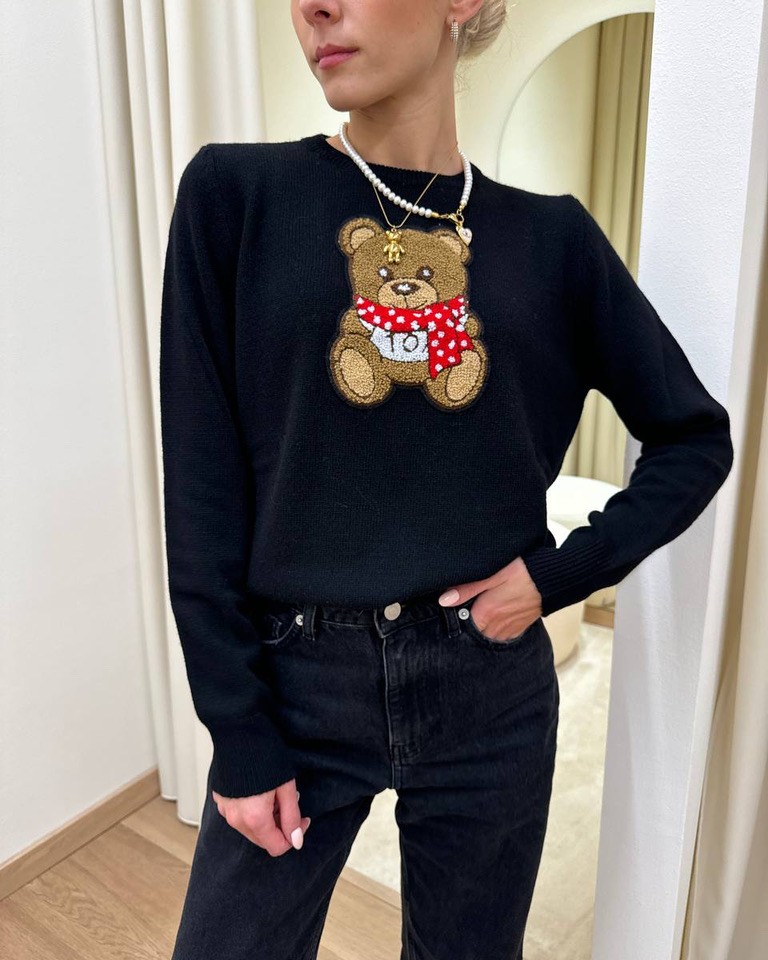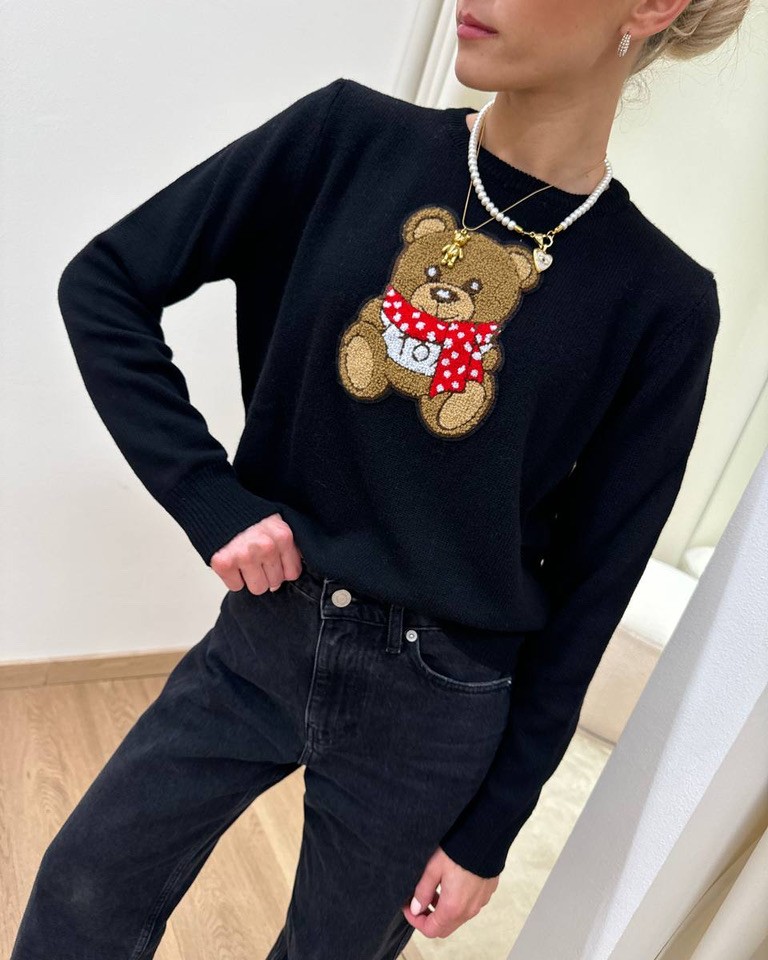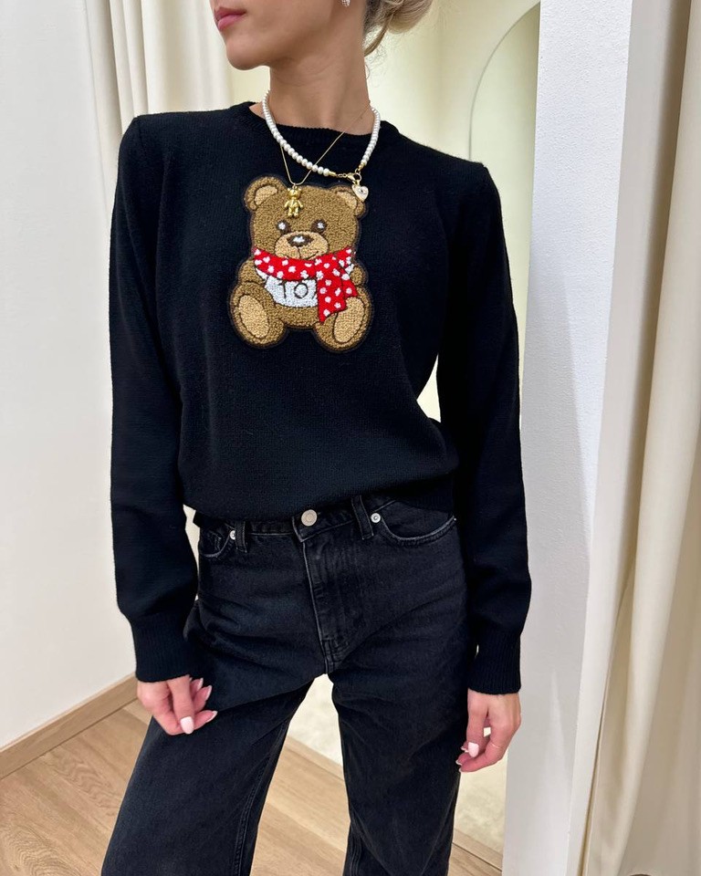 Maglia nera girocollo, con patch orsetto natalizio con sciarpa sul davanti. Modello con fondo polsi e collo a coste elasticizzati, con viscosa, lana e cachemire.
