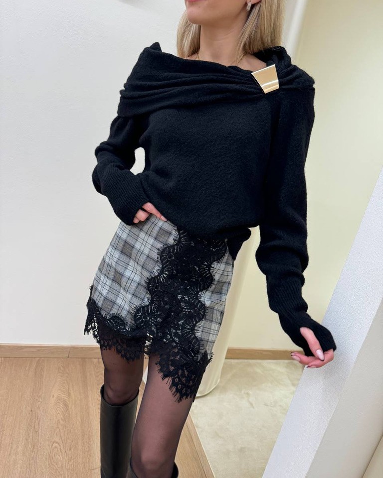 Maglia nera con lana e viscosa, modello a maniche lunghe con scollatura schiffer rappresa da un dettaglio metallico dorato. costine alte su fondo e maniche. Vestibilità regolare.