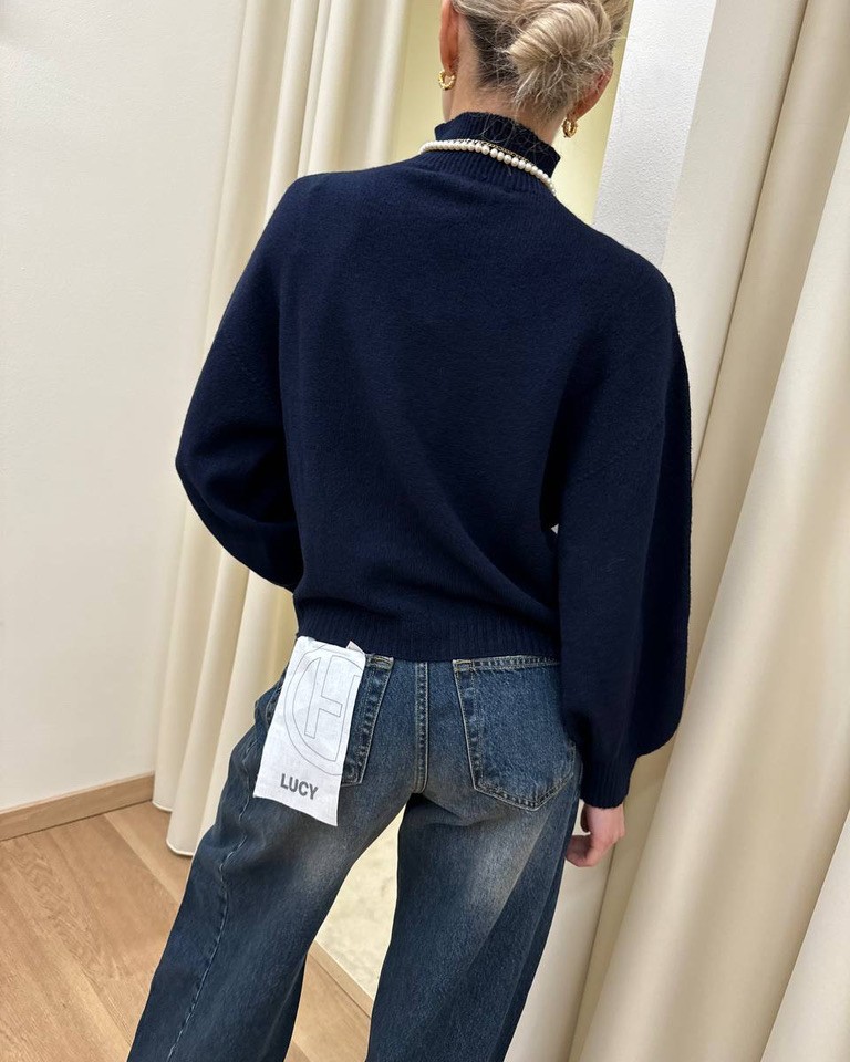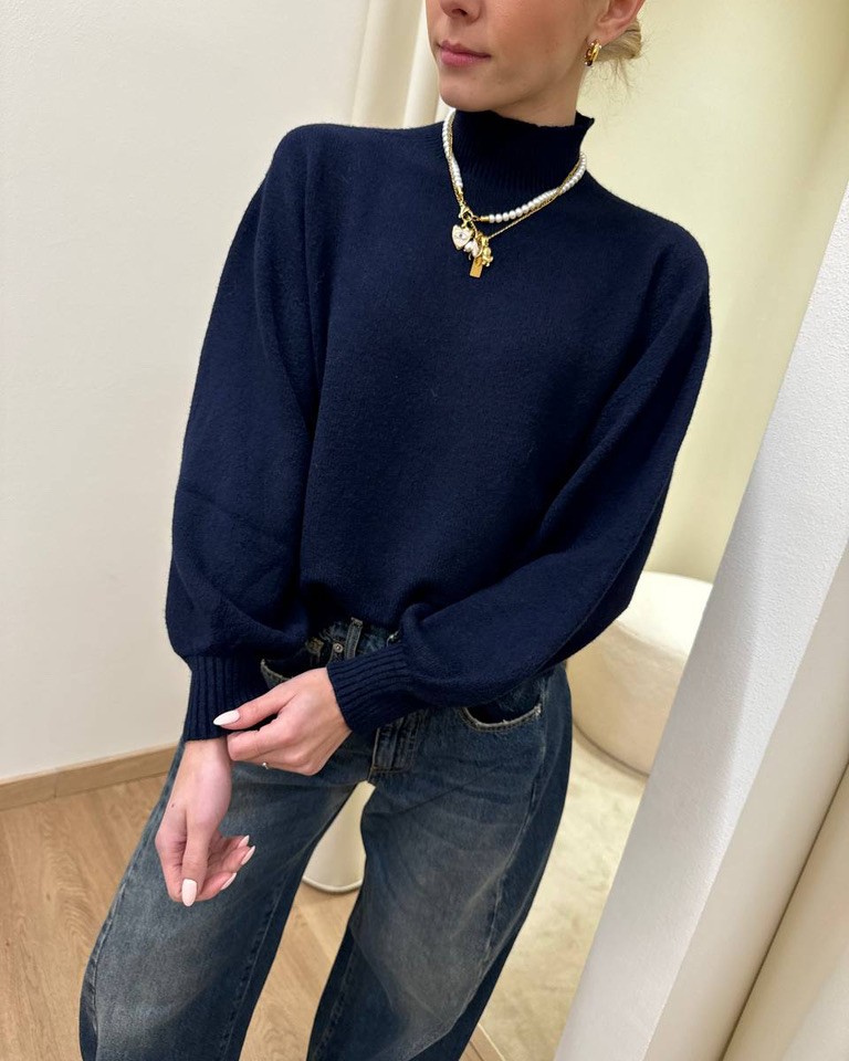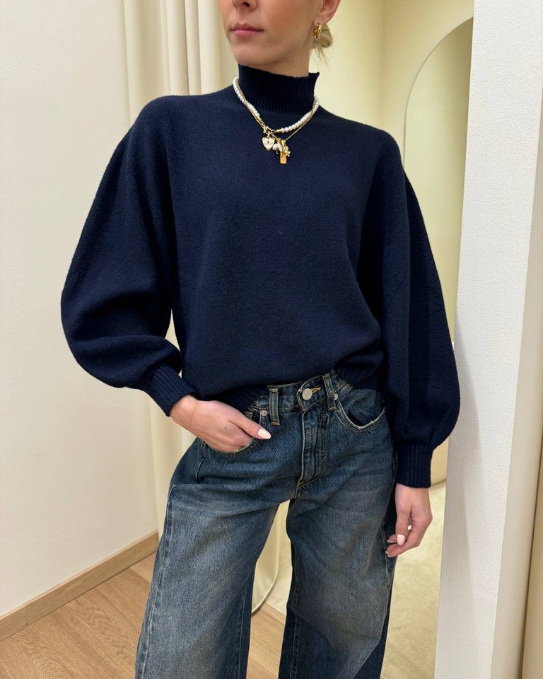 Maglia color blu con viscosa, modello over, collo alto, maniche lunghe scese a palloncino con polsino. Elastico su collo e fondo a coste. Vestibilità ampia.