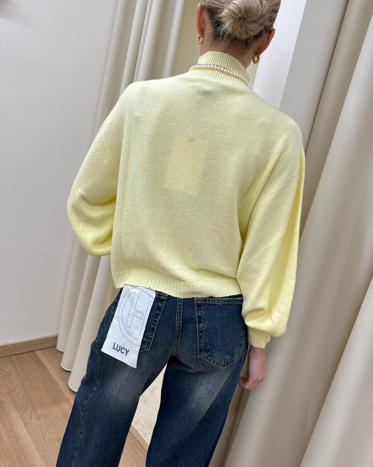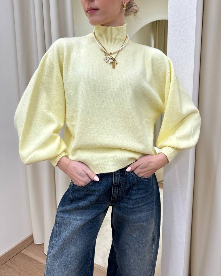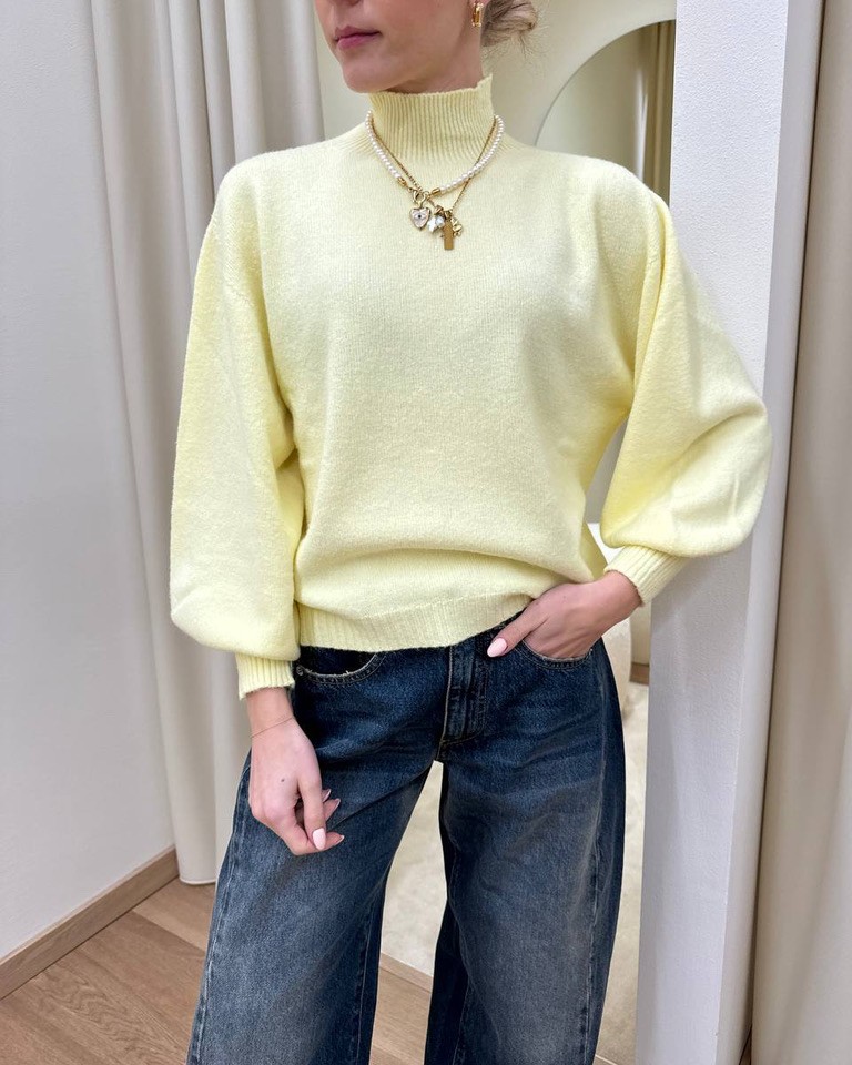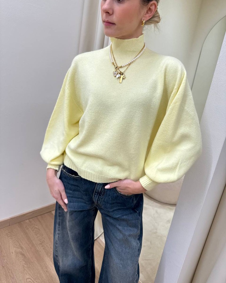 Maglia color giallo pastello con viscosa, modello over, collo alto, maniche lunghe scese a palloncino con polsino. Elastico su collo e fondo a coste. Vestibilità ampia.