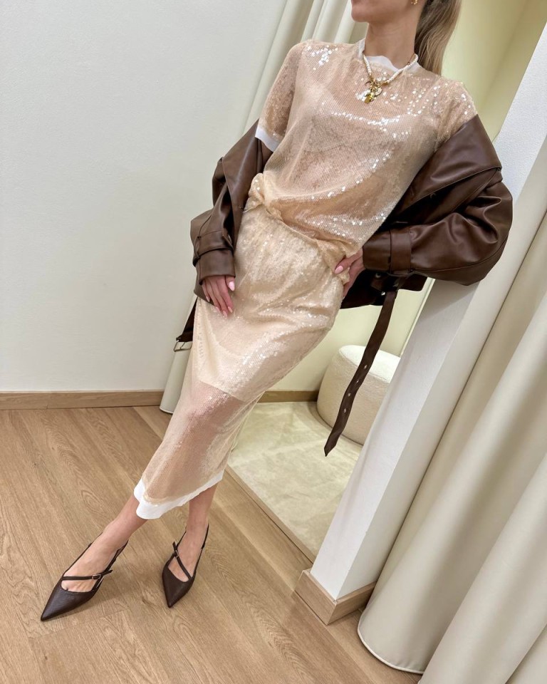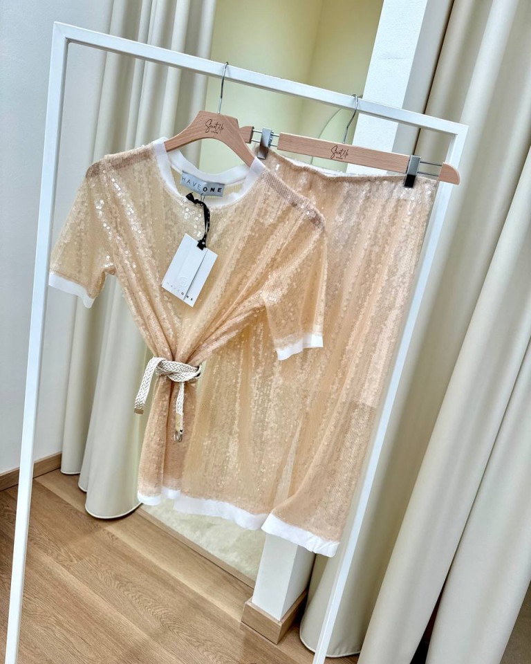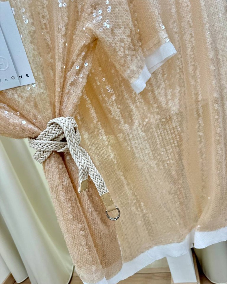 Maglia semitrasparente beige ricoperta da paillettes, modello t-shirt over, mezza manica, girocollo con bordini in tessuto bianco e cinturino in corda abbinato. Vestibilità regolare.