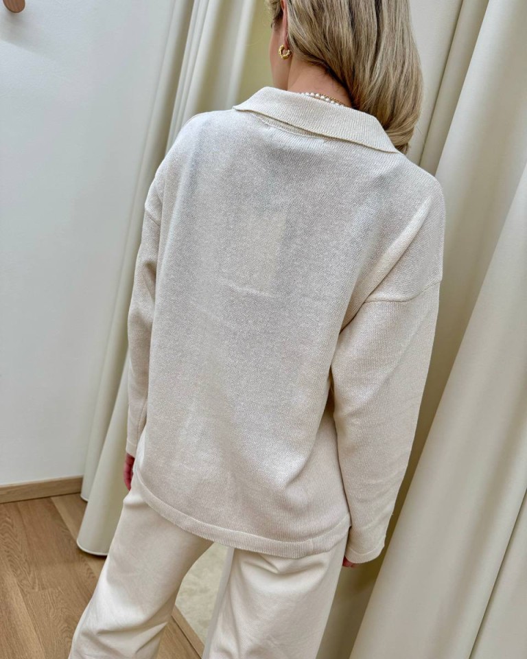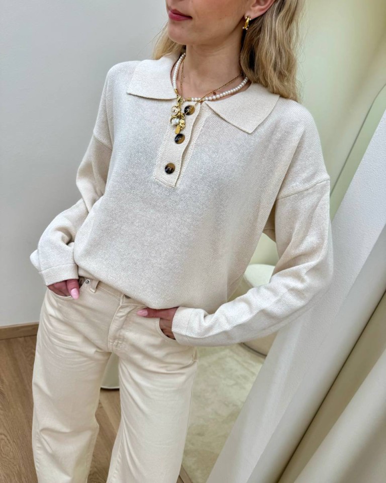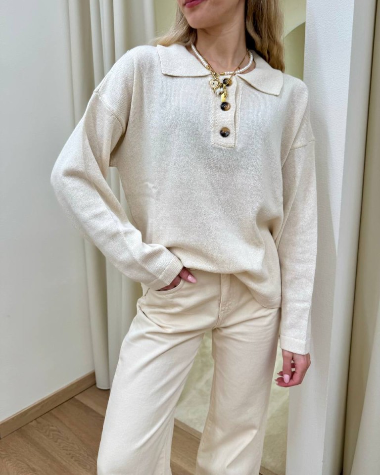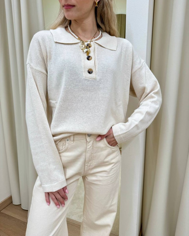 Maglia avorio, modello polo basic oversize a scatoletta, colletto con bottoni e maniche lunghe e scese. Vestibilità ampia.