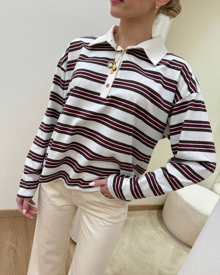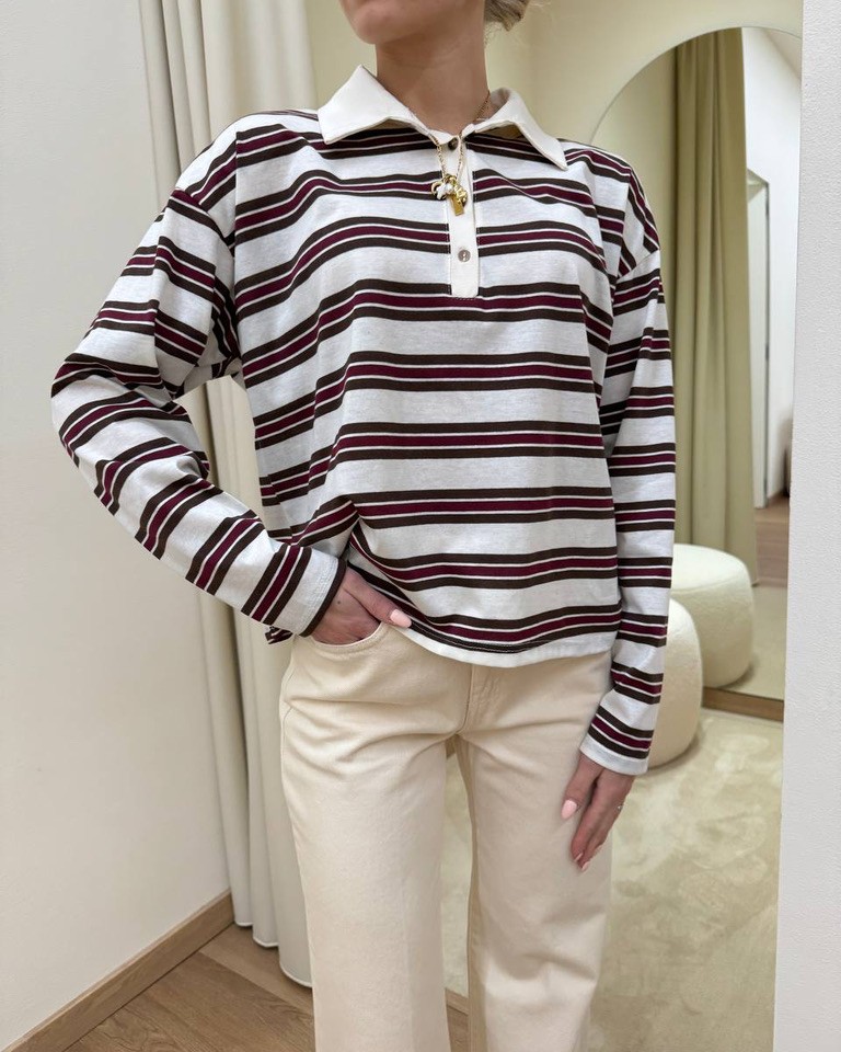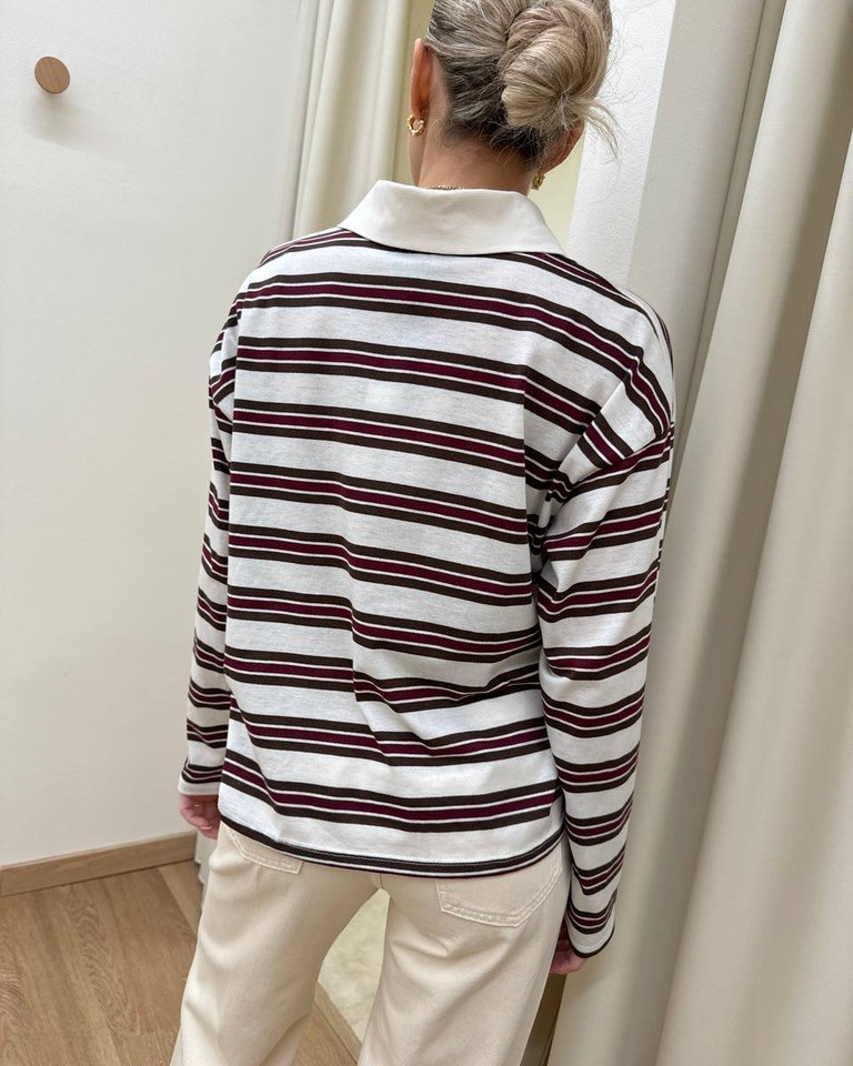 Maglia a righe panna, moro e bordeaux. Modello polo, over con maniche lunghe scese, colletto classico con bottoni. Vestibilità ampia.
