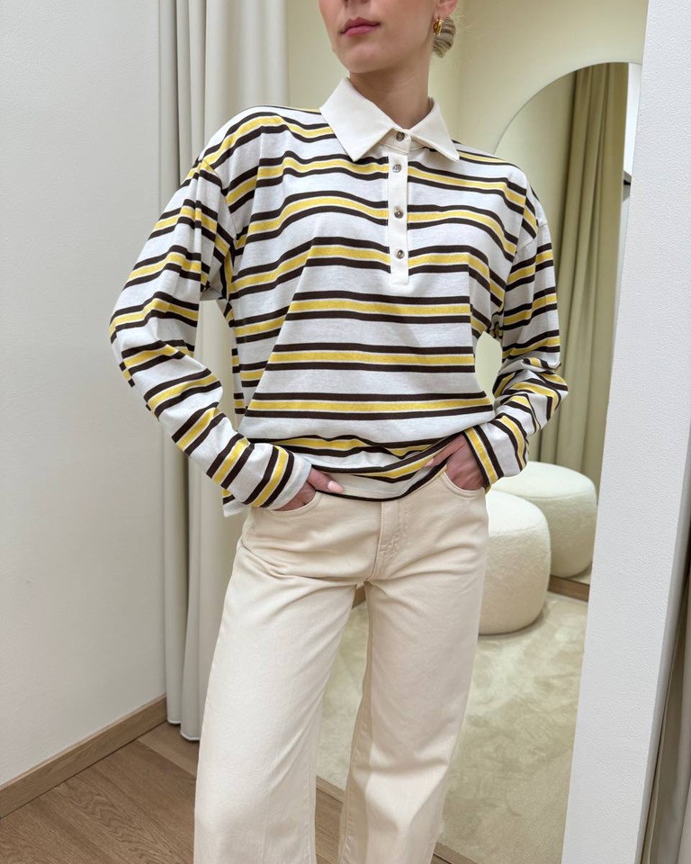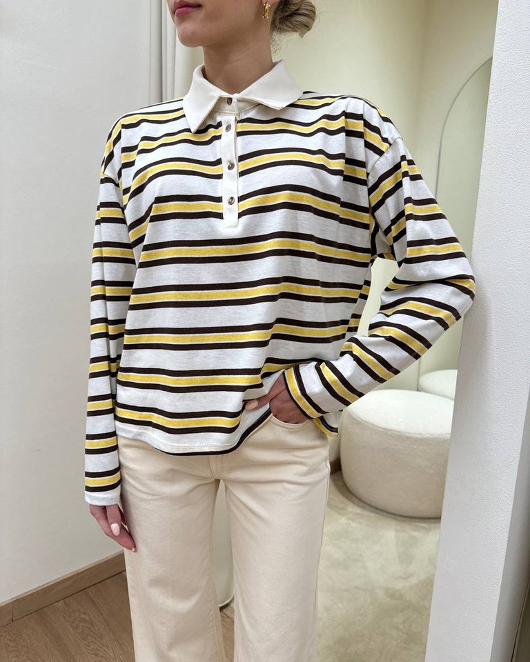 Maglia a righe panna, moro e giallo. Modello polo, over con maniche lunghe scese, colletto classico con bottoni. Vestibilità ampia.