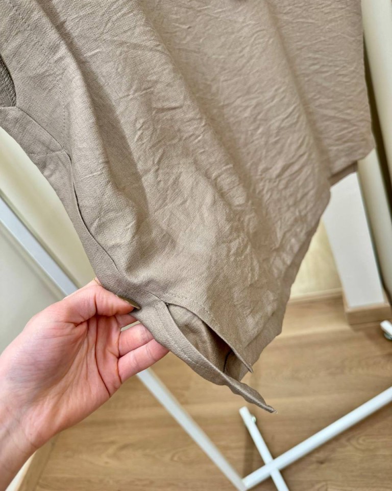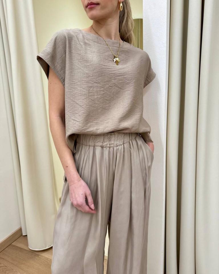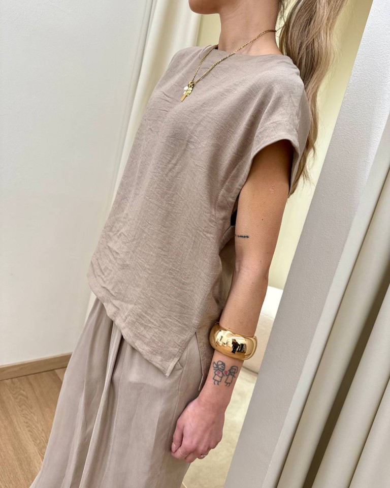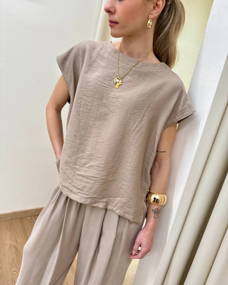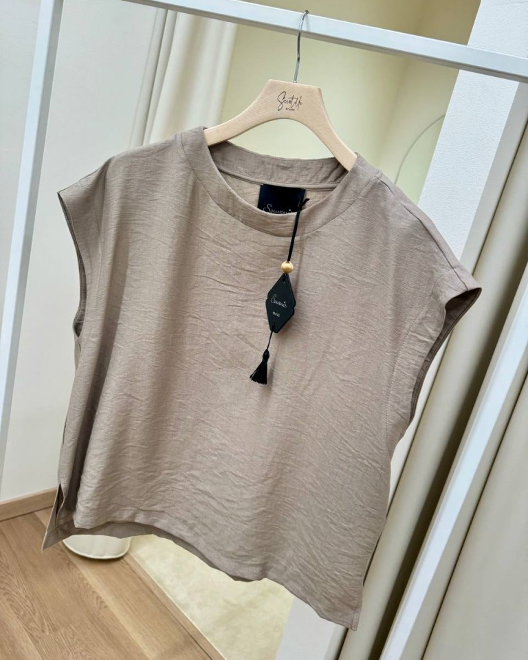 Maglia color sabbia, modello a scatoletta smanicato, girocollo, spacchetti laterali, davanti leggermente più corto del dietro. Vestibilità ampia.
