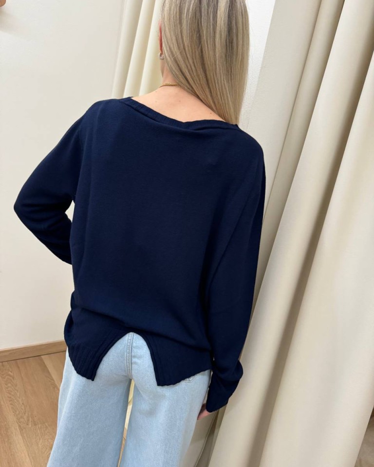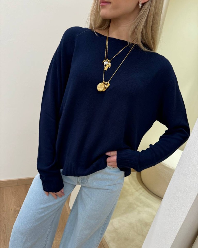 Maglia blu, modello over a scatoletta, girocollo, manica lunga, bordi a coste su scollo, maniche e fondo, spacchetto centrale dietro. Vestibilità ampia.