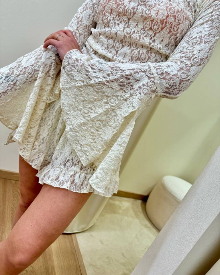 Maglia in pizzo semitrasparente burro, modello con arricciatura sui fianchi, scollo shiffer e maniche lunghe a campana. Vestibilità regolare elasticizzata.