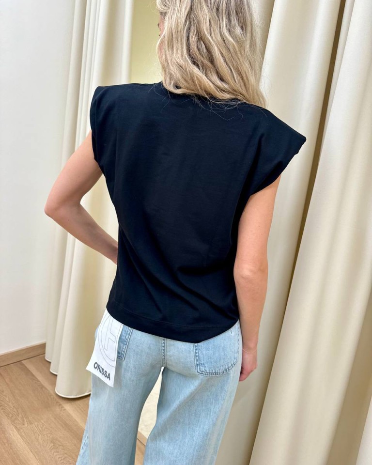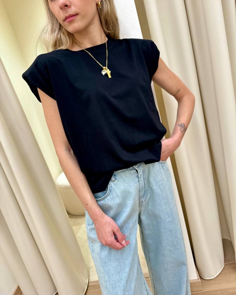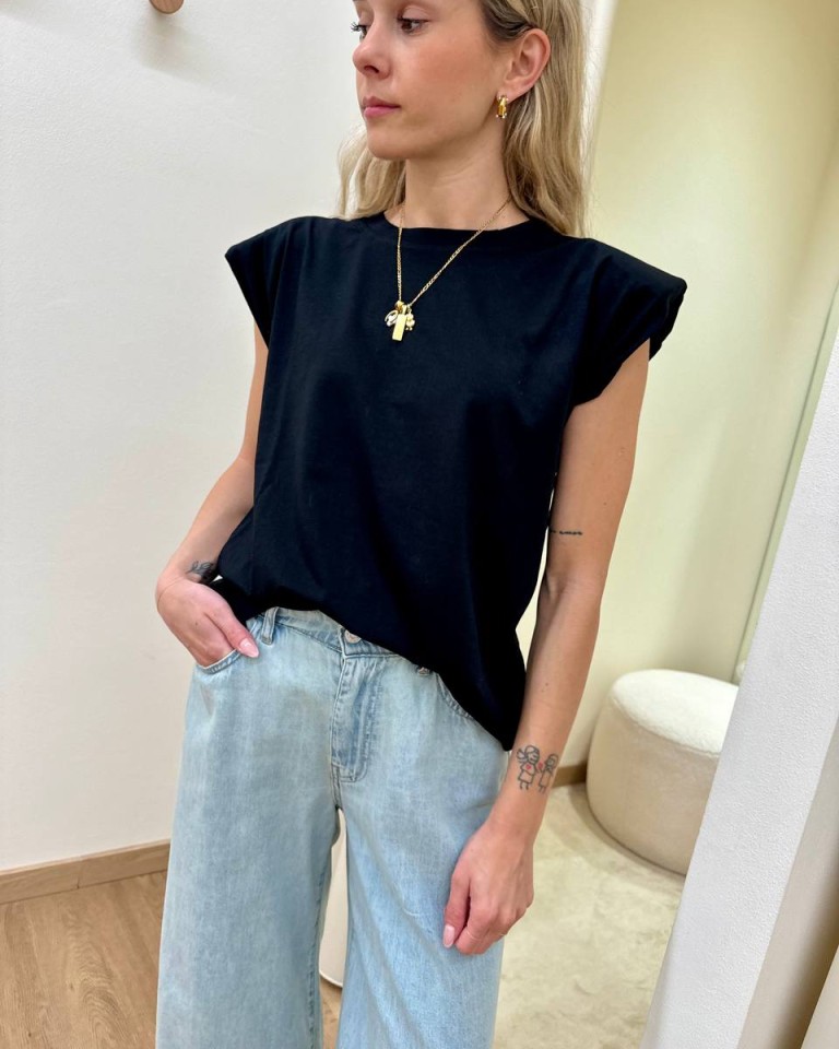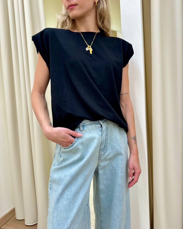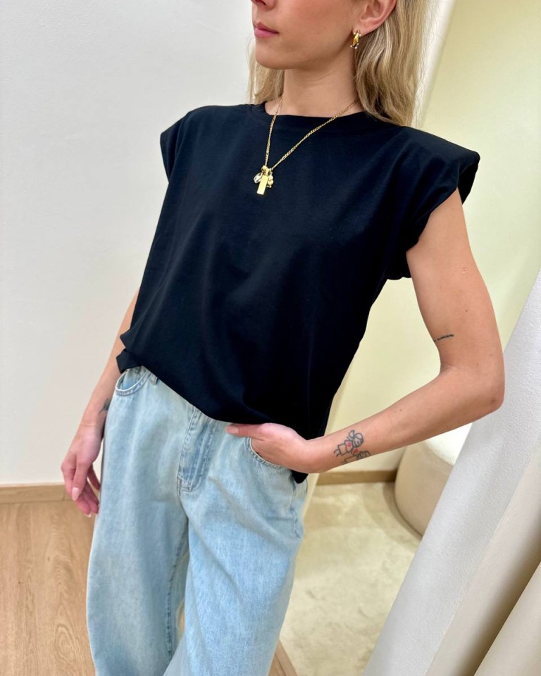 Maglia nera, modello dritto, girocollo e smanicato con spalline imbottite. Vestibilità ampia.