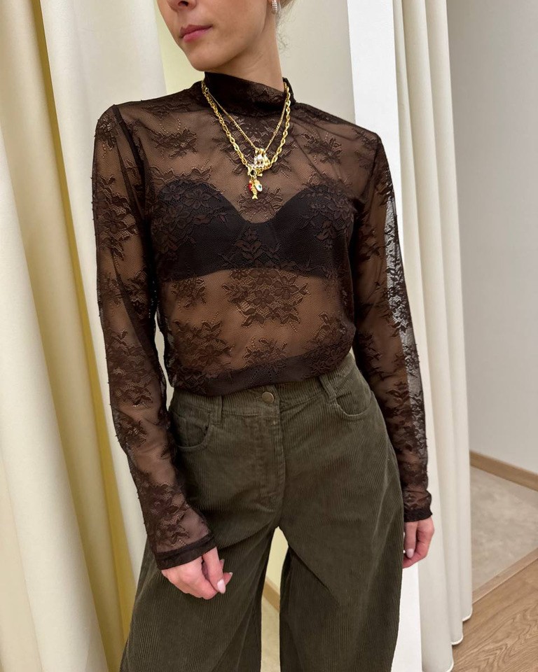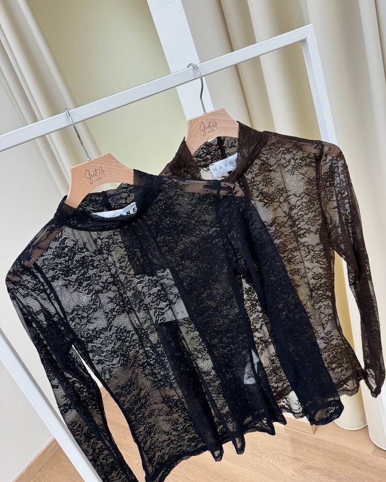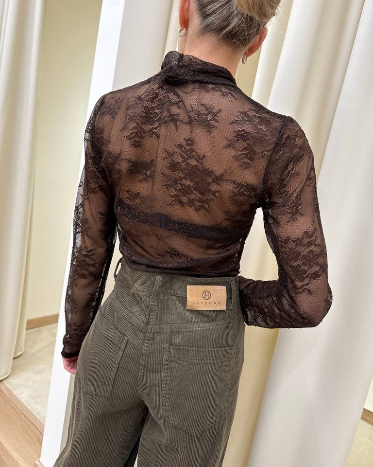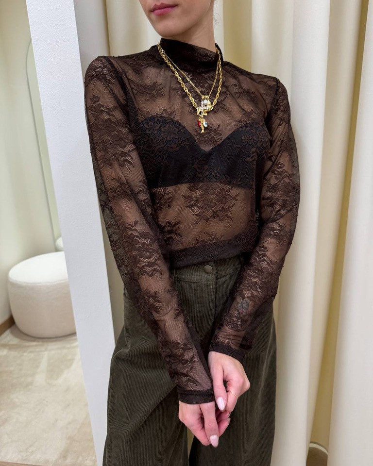 Maglietta trasparente in pizzo moro, modello maniche lunghe, mezzo collo alto con vestibilità regolare.