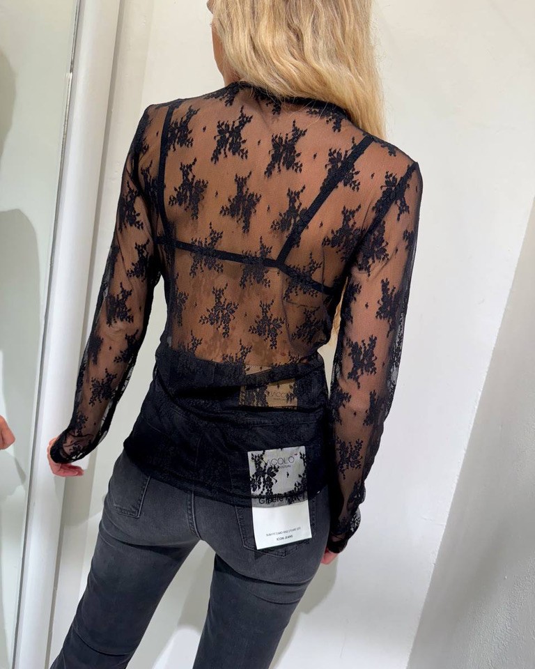Maglietta nera trasparente con pizzo, modello maniche lunghe, girocollo con bralette abbinata. Vestibilità regolare.