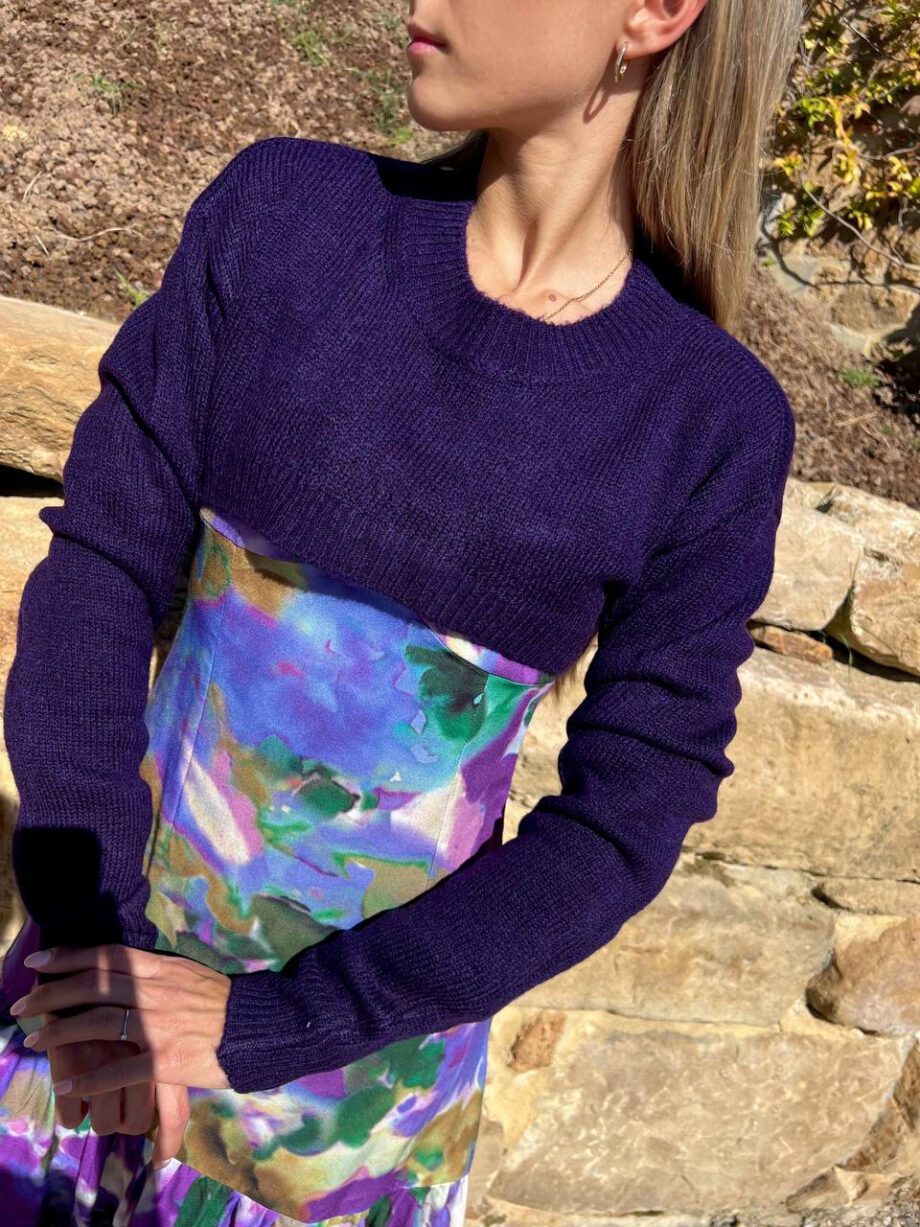 Maglioncino viola in lana e viscosa, modello cropped, girocollo e maniche lunghe scese. Fondo stondato ed elastico su collo, polsi e fondo. Vestibilità corta.
