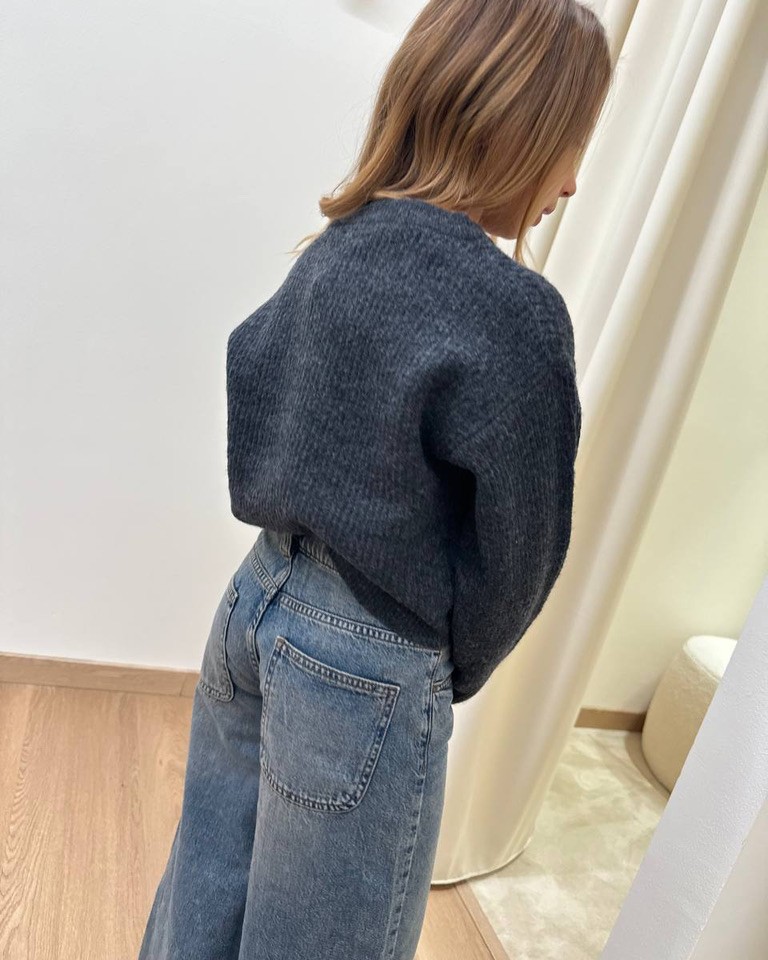 Maglione color antracite in maglia inglese, modello scatoletta giroocollo, maniche lunghe ed elastici sui profili a coste. Vestibilità regolare.