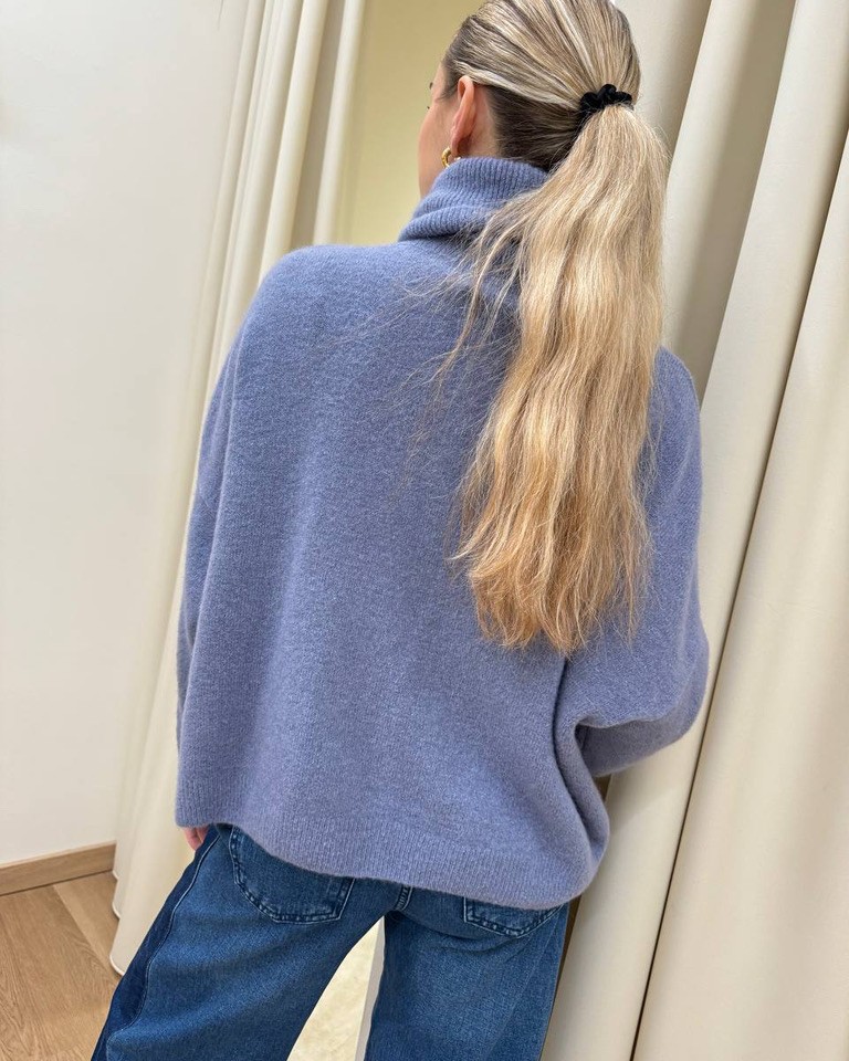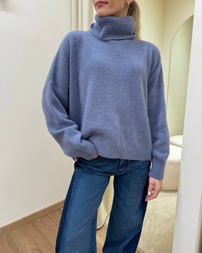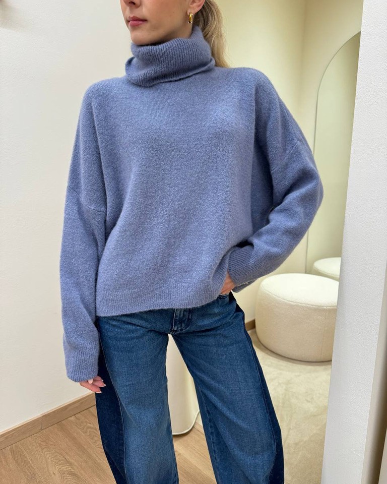Maglione carta zucchero con alpaca. Modello over a scatoletta con collo alto, giro manica sceso, costine su polsi, fondo e collo. Vestibilità ampia.