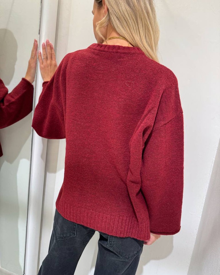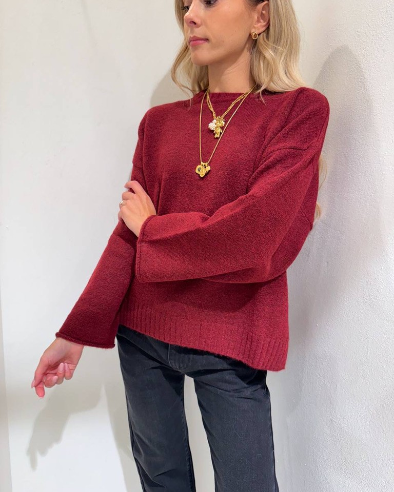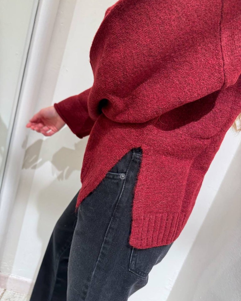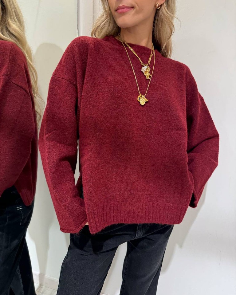 Maglione color ciliegia in viscosa e lana, modello girocollo, maniche lunghe scese e ampie sul fondo con rotolino. Girocollo e spacchi laterali. Elastico su collo e fondo a coste. Vestibilità morbida.