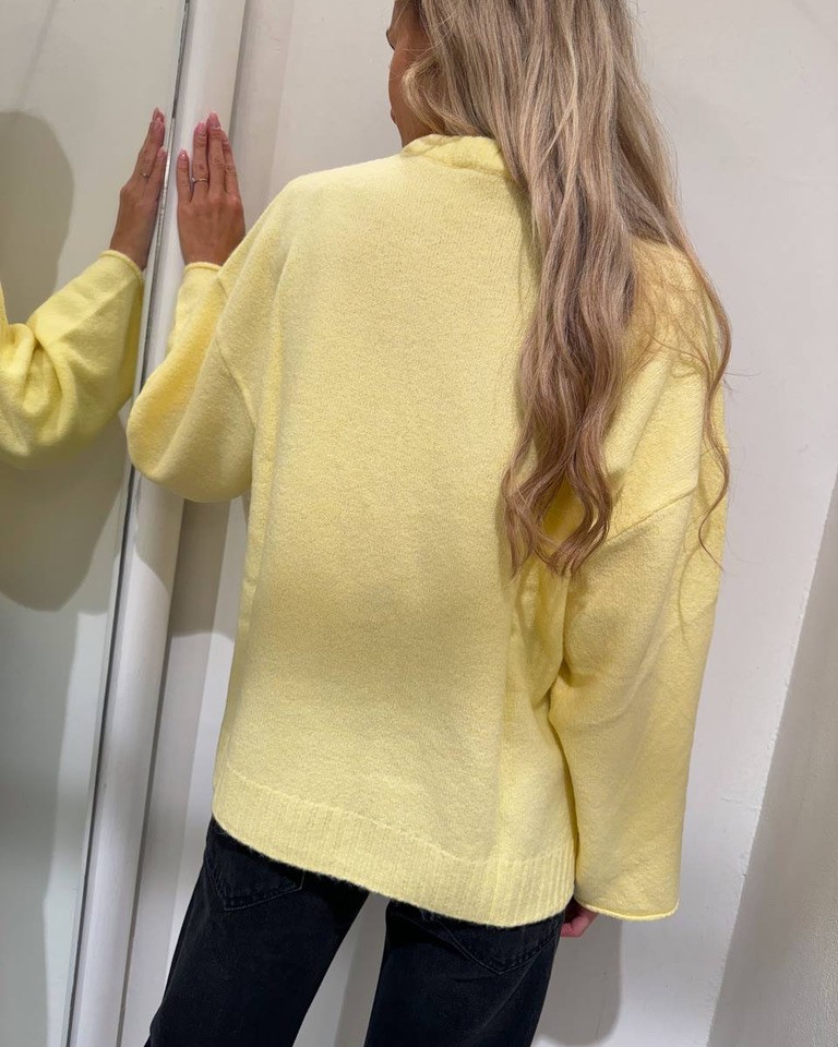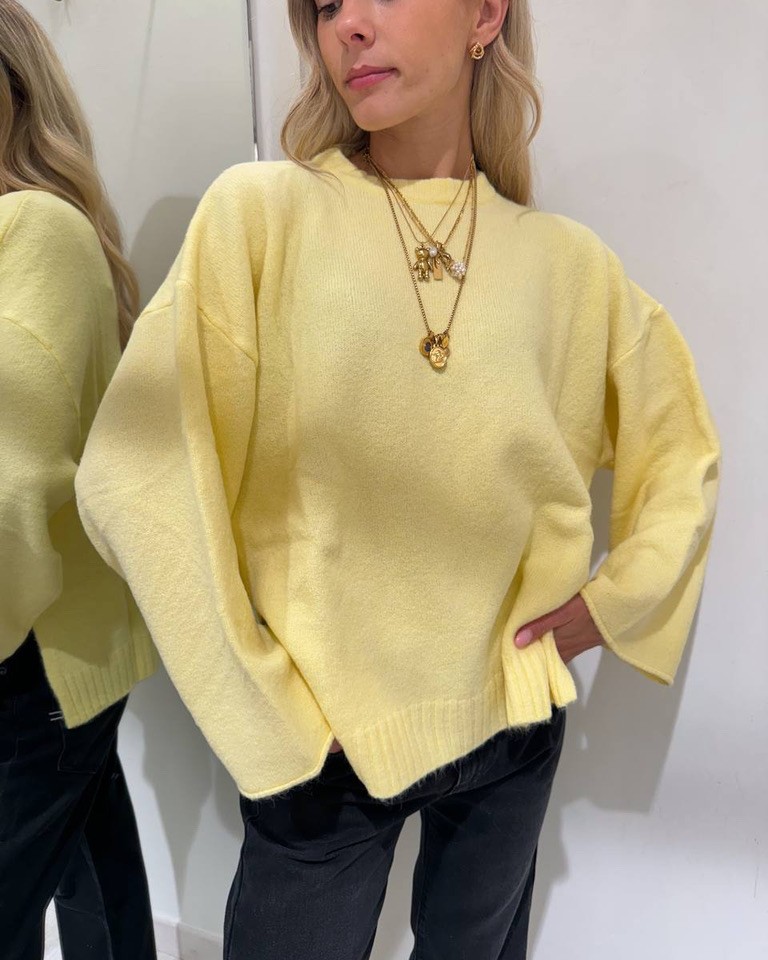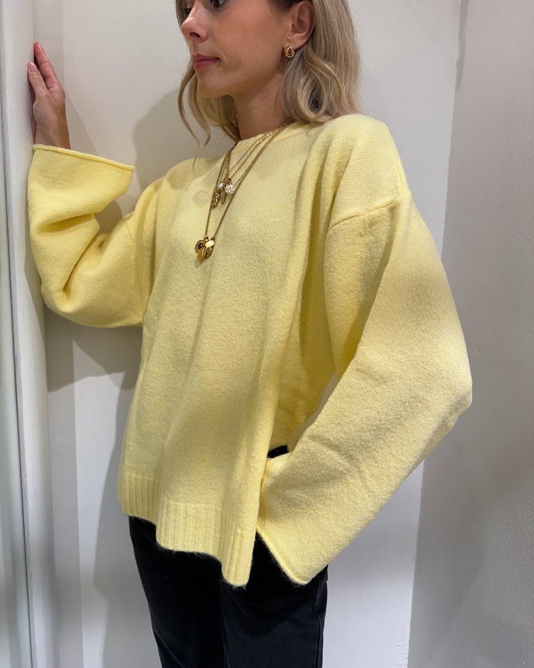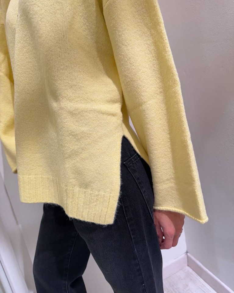 Maglione color giallo in viscosa e lana, modello girocollo, maniche lunghe scese e ampie sul fondo con rotolino. Girocollo e spacchi laterali. Elastico su collo e fondo a coste. Vestibilità morbida.