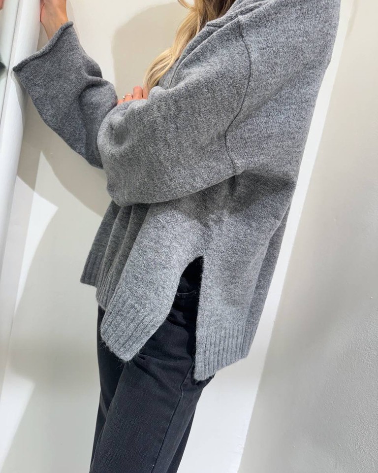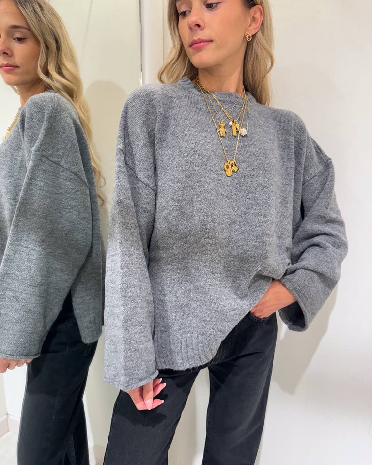 Maglione color grigio in viscosa e lana, modello girocollo, maniche lunghe scese e ampie sul fondo con rotolino. Girocollo e spacchi laterali. Elastico su collo e fondo a coste. Vestibilità morbida.