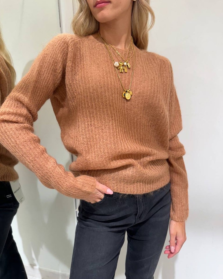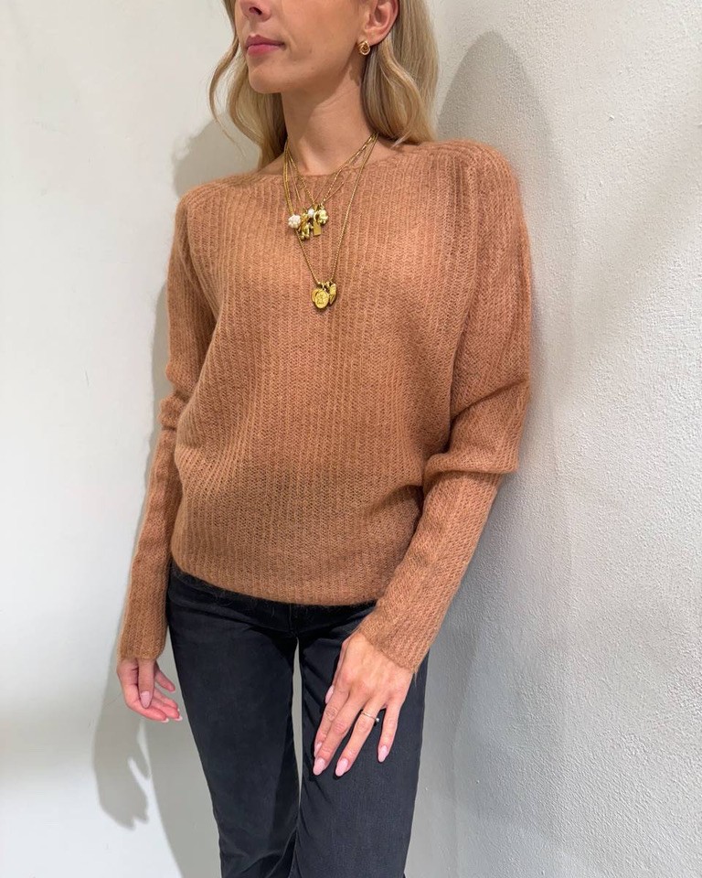Maglia color biscotto in maglia sottile in mohair, modello scollo barca con maniche lunghe. Elastico sottile su fondo e polsi. Vestibilità regolare.