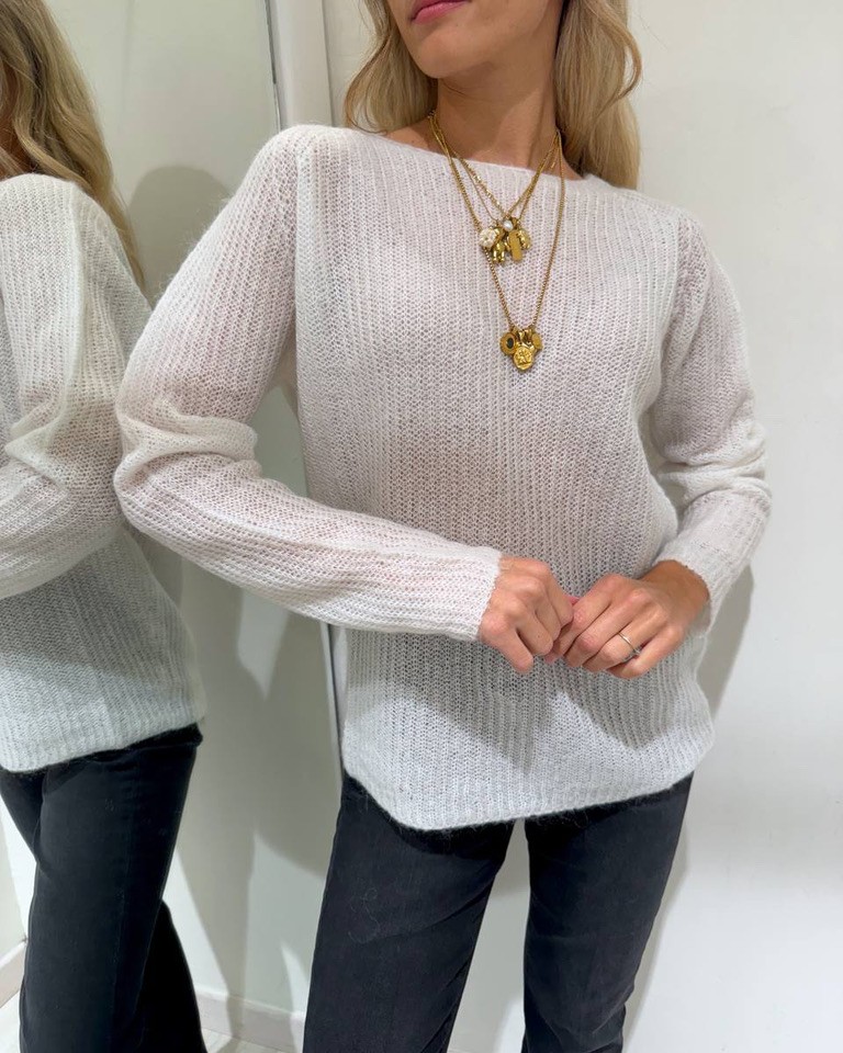 Maglia color panna in maglia sottile in mohair, modello scollo barca con maniche lunghe. Elastico sottile su fondo e polsi. Vestibilità regolare.