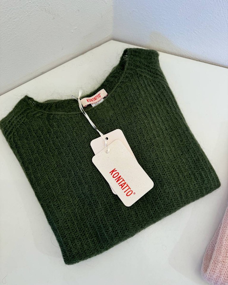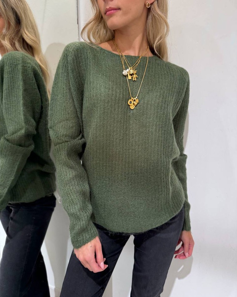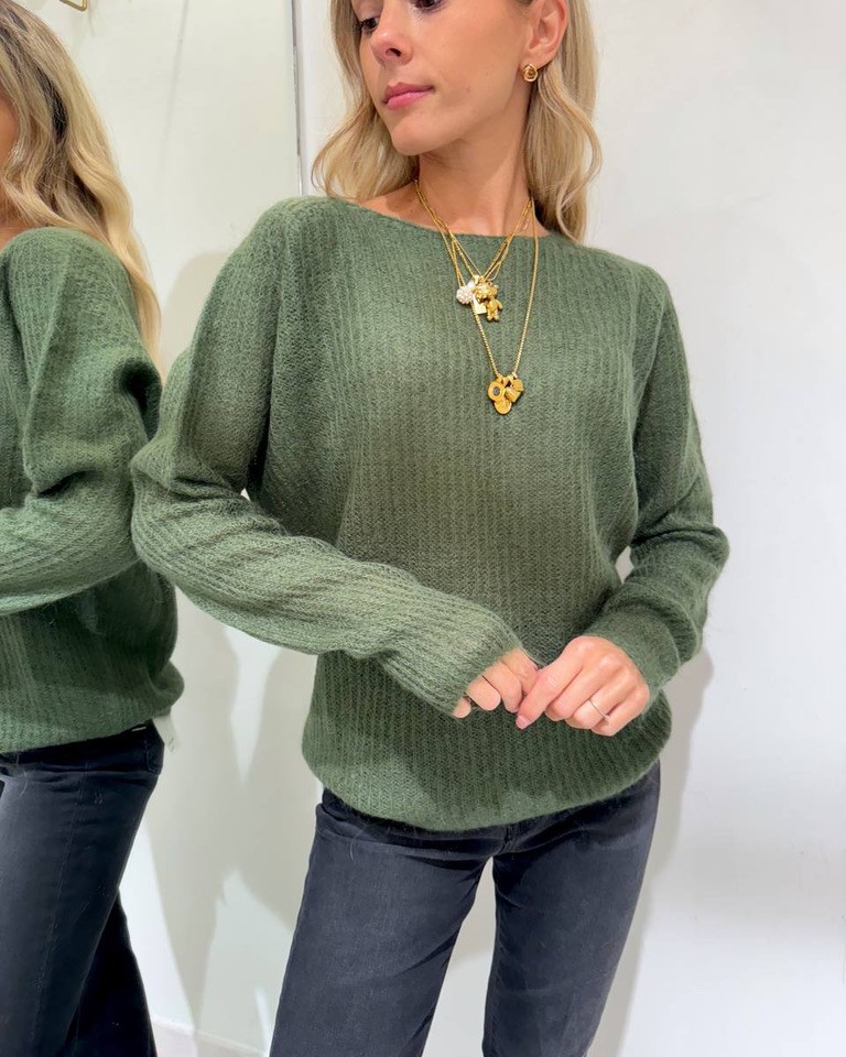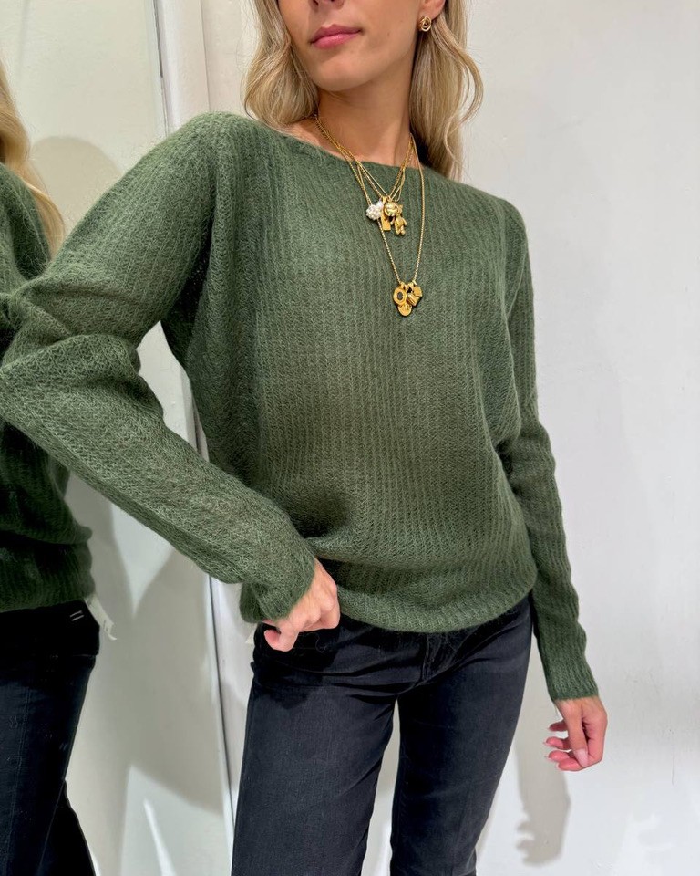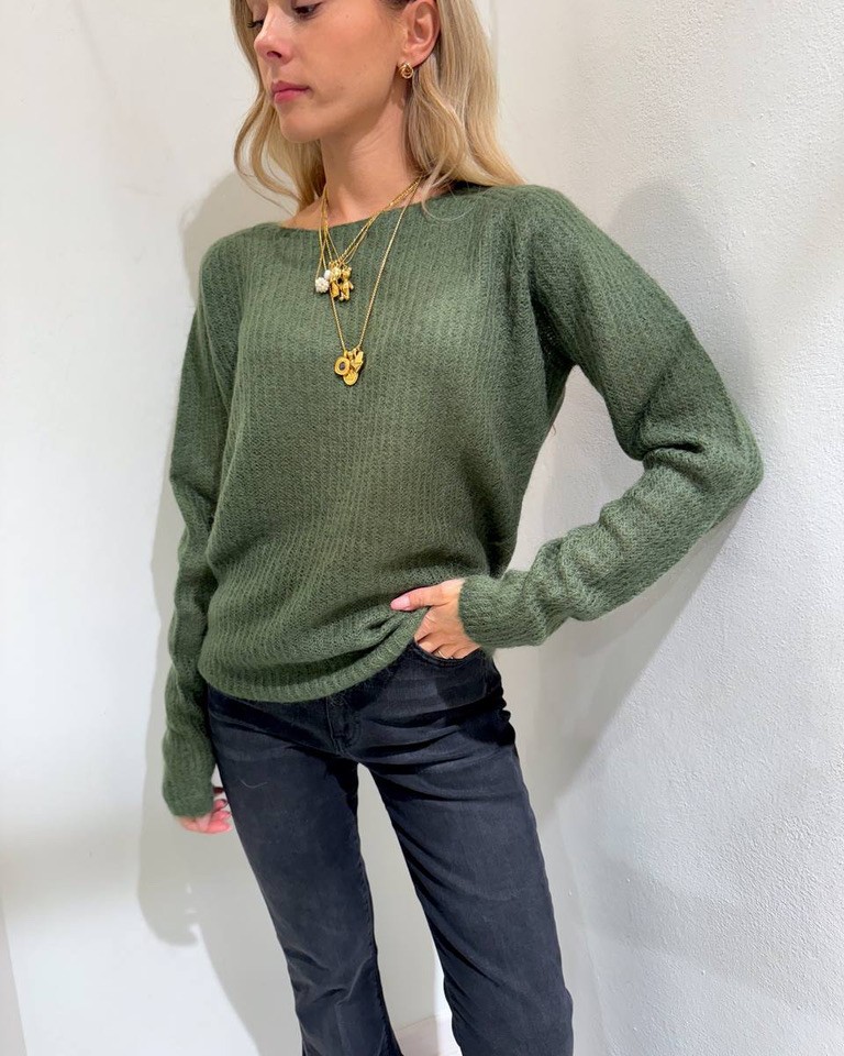 Maglia color verde oliva in maglia sottile in mohair, modello scollo barca con maniche lunghe. Elastico sottile su fondo e polsi. Vestibilità regolare.