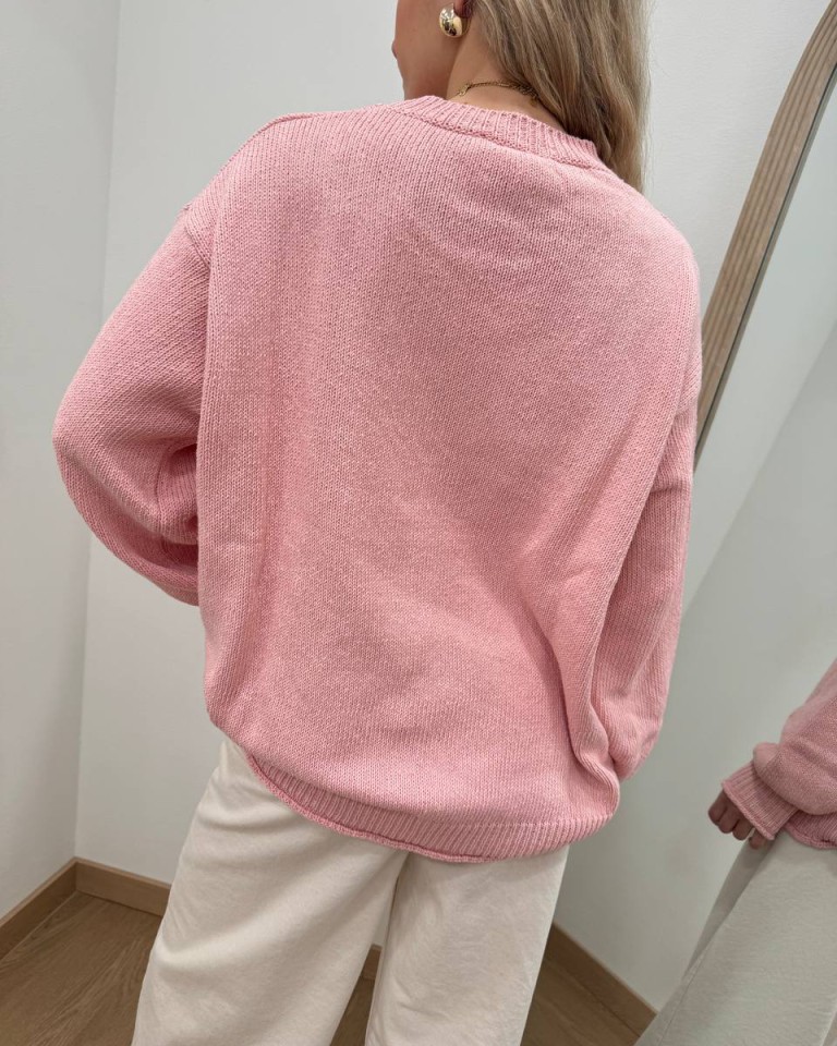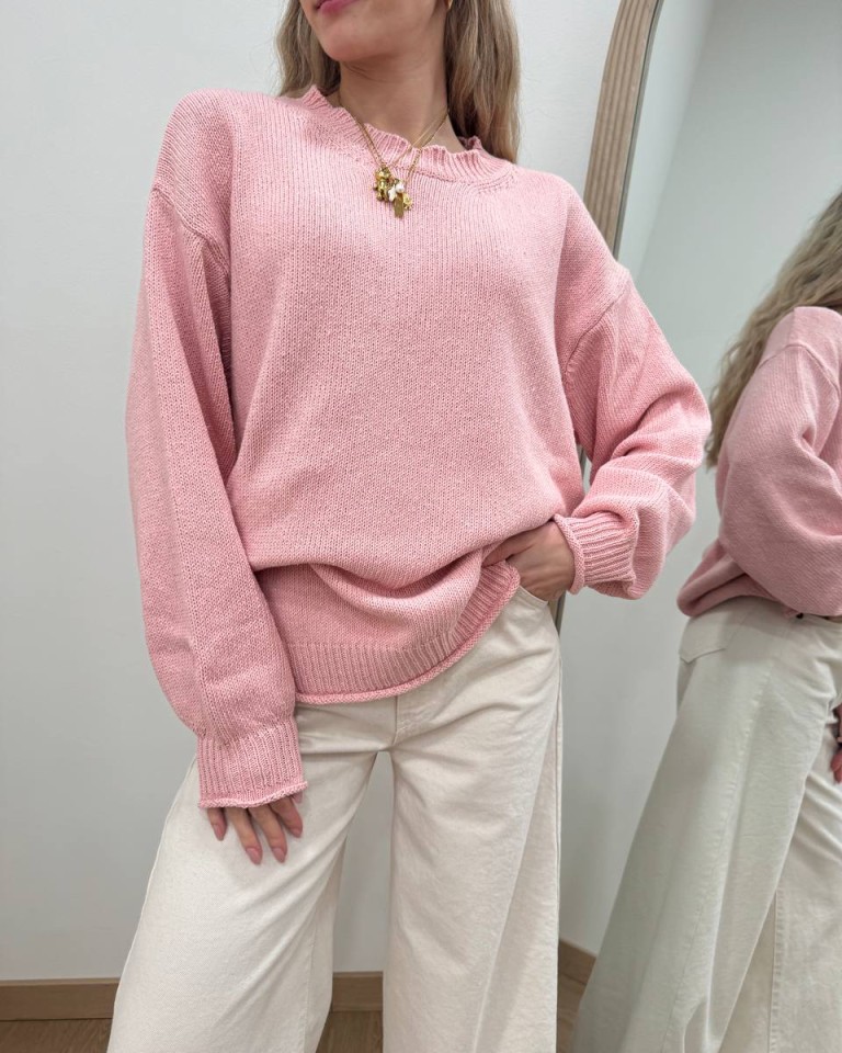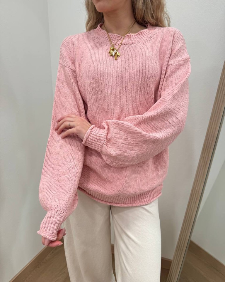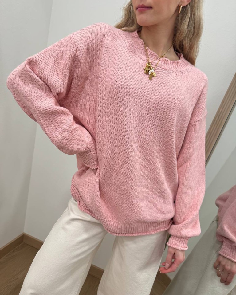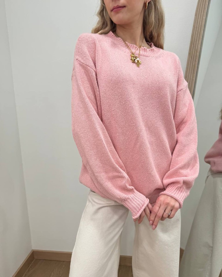 Maglione rosa pastello, modello basic overzise, girocollo e manica lunga con giro sceso e polsi aderenti, costine su fondo e polsi con orlo arrotolato. Vestibilità ampia.