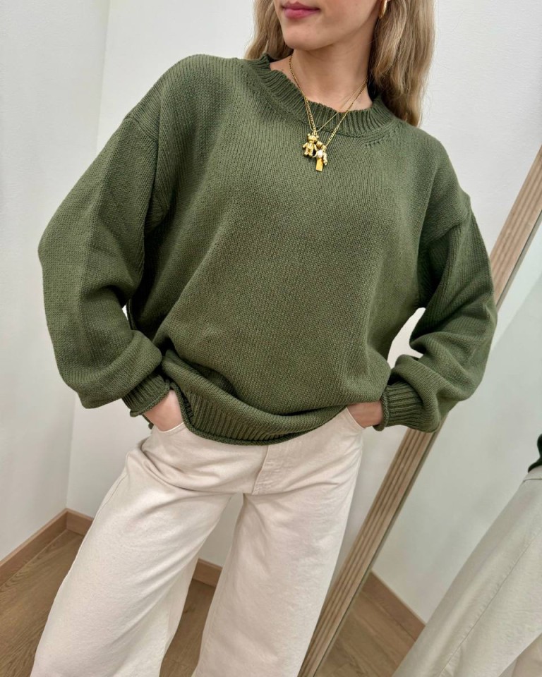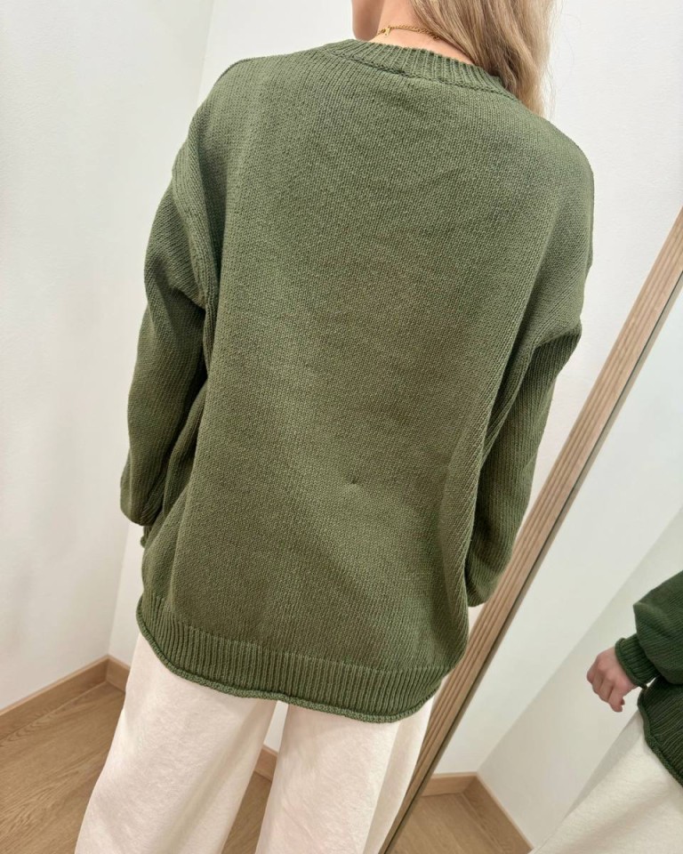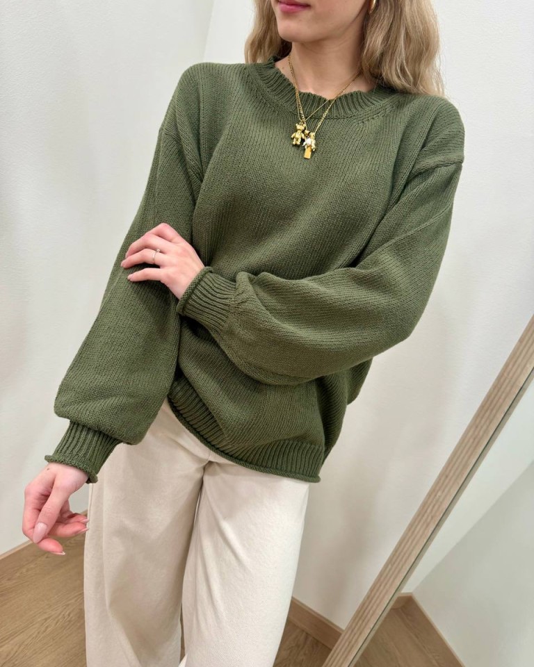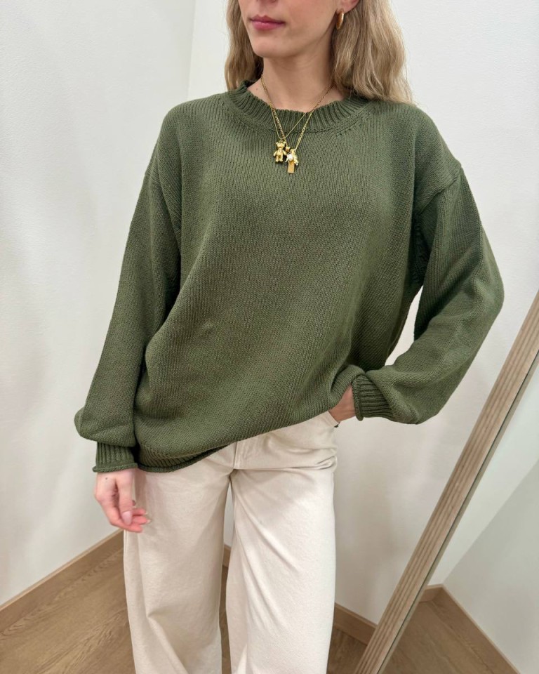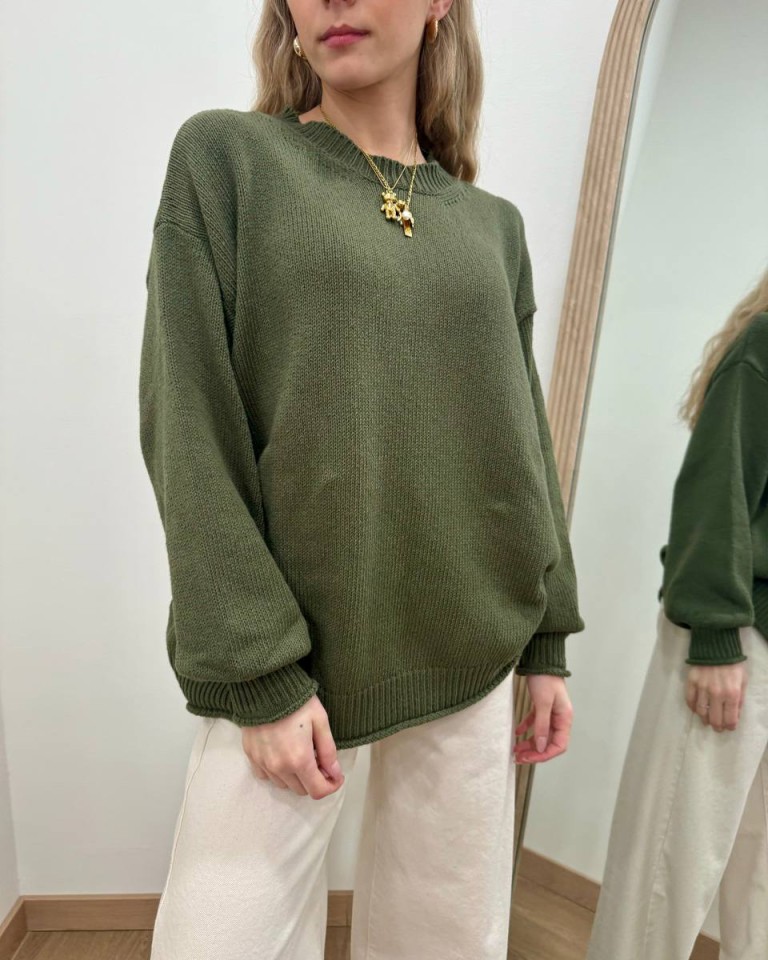Maglione verde militare, modello basic overzise, girocollo e manica lunga con giro sceso e polsi aderenti, costine su fondo e polsi con orlo arrotolato. Vestibilità ampia.