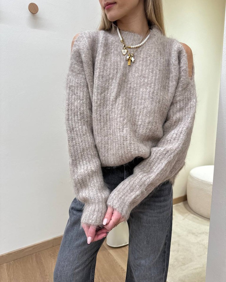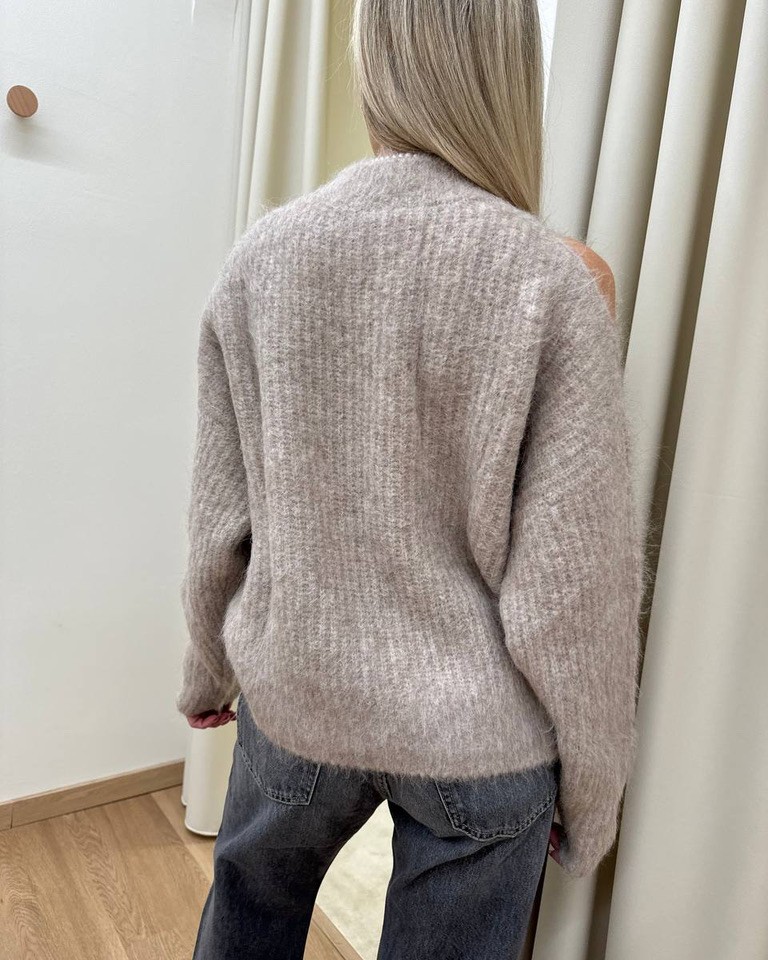Maglione color beige con alpaca, modello ampio, girocollo, maniche lunghe con cut out sulle spalle. Vestibilità ampia.