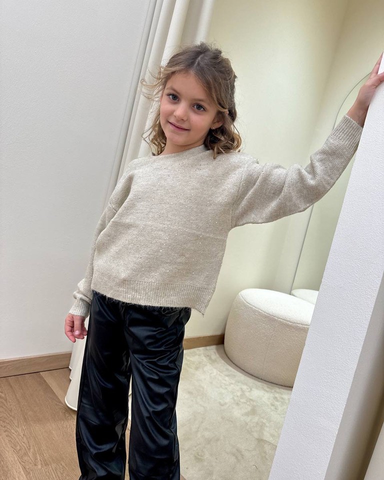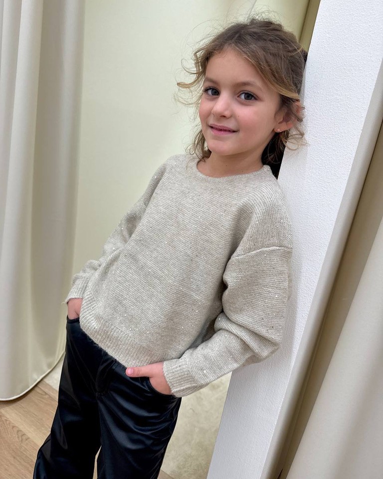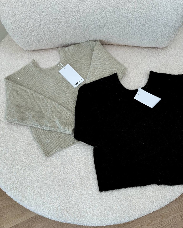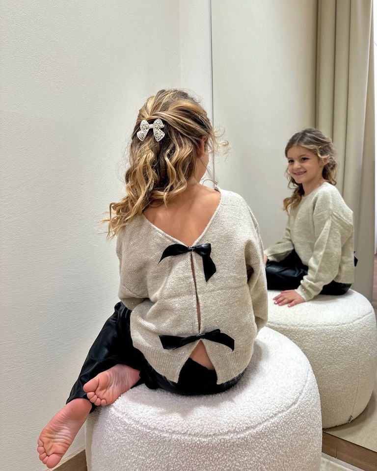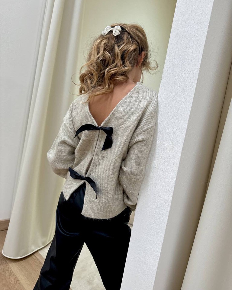 Maglione beige con micro paillettes, modello girocollo, maniche lunghe , scollo a v sul dietro con due fiocchi. Vestibilità regolare.