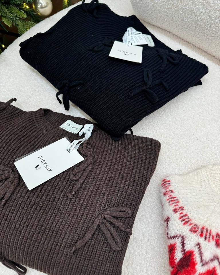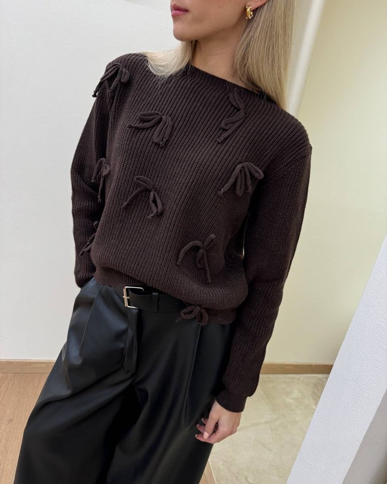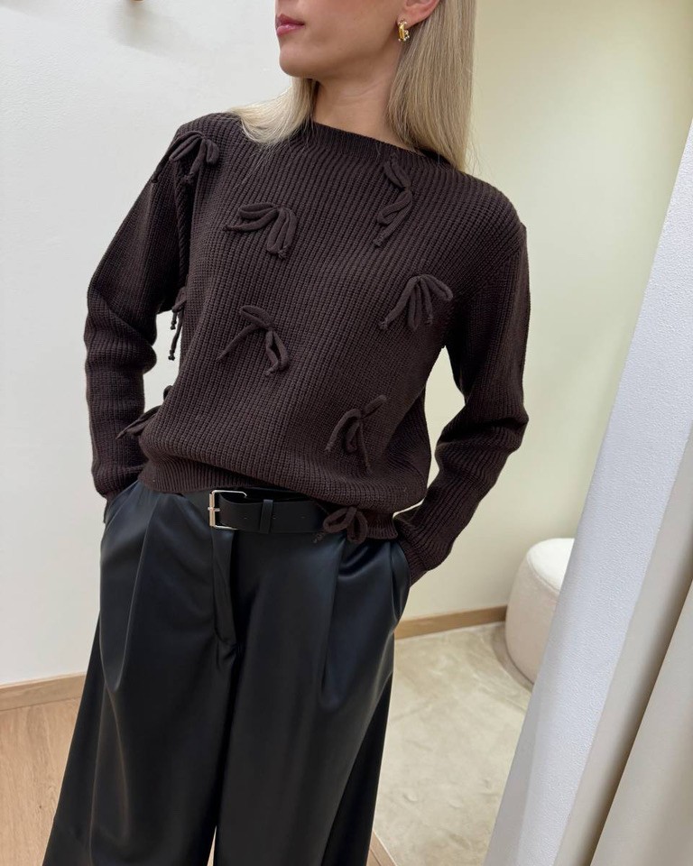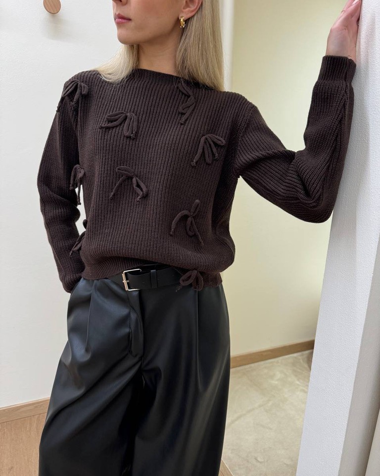 Maglione moro con viscosa con fiocchetti tridimensionali sul davanti, modello girocollo con maniche lunghe. Vestibilità regolare.