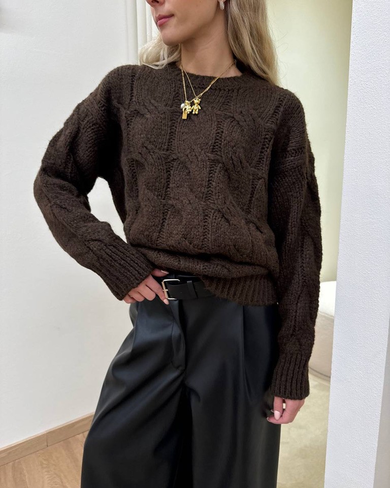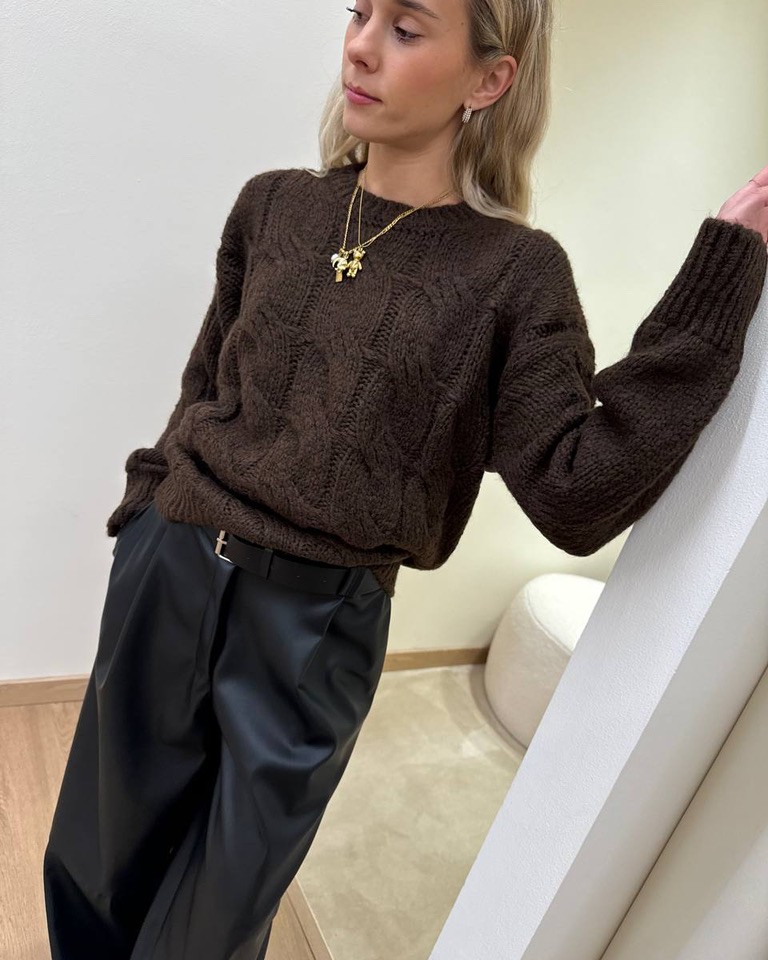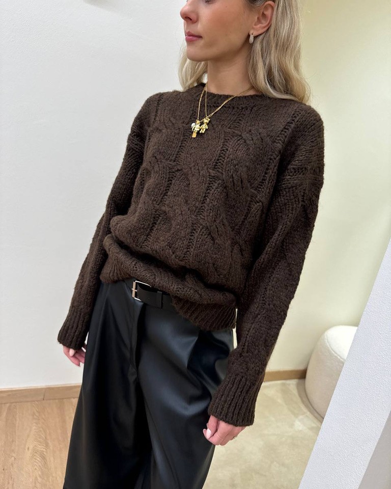 Maglione moro a trecce con lana e alpaca, modello girocollo, maniche lunghe scese e profili con elastici a coste larghe. Vestibilità morbida.