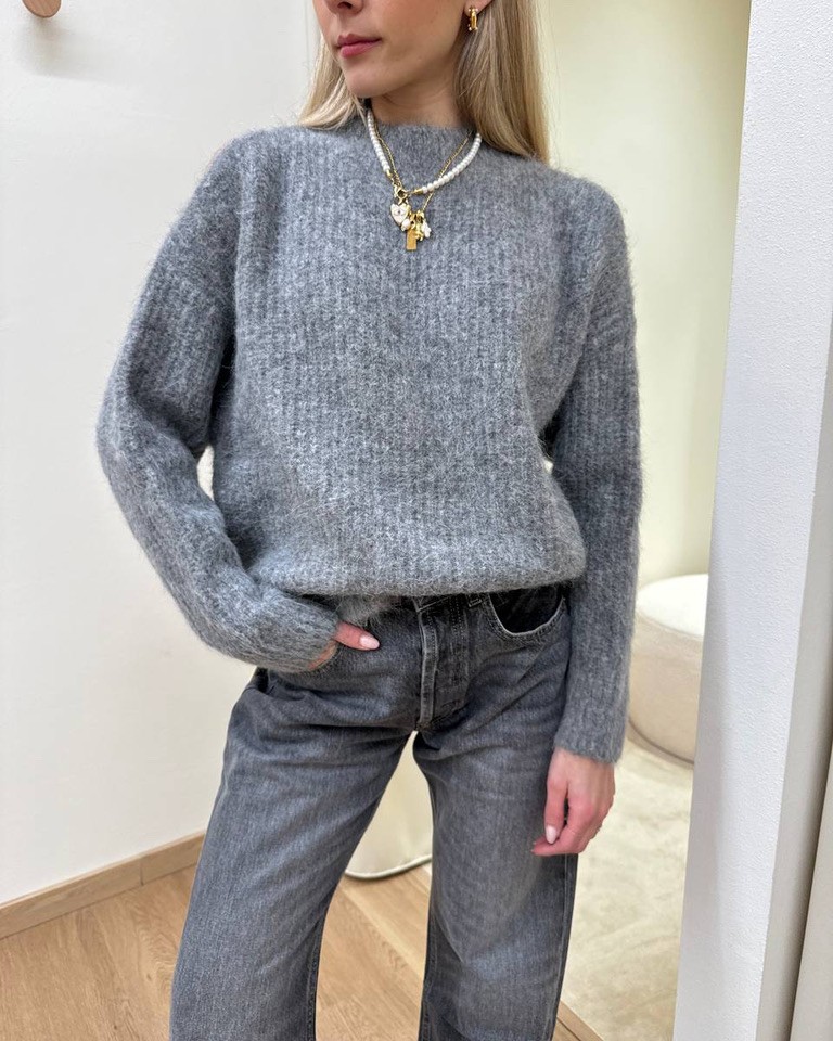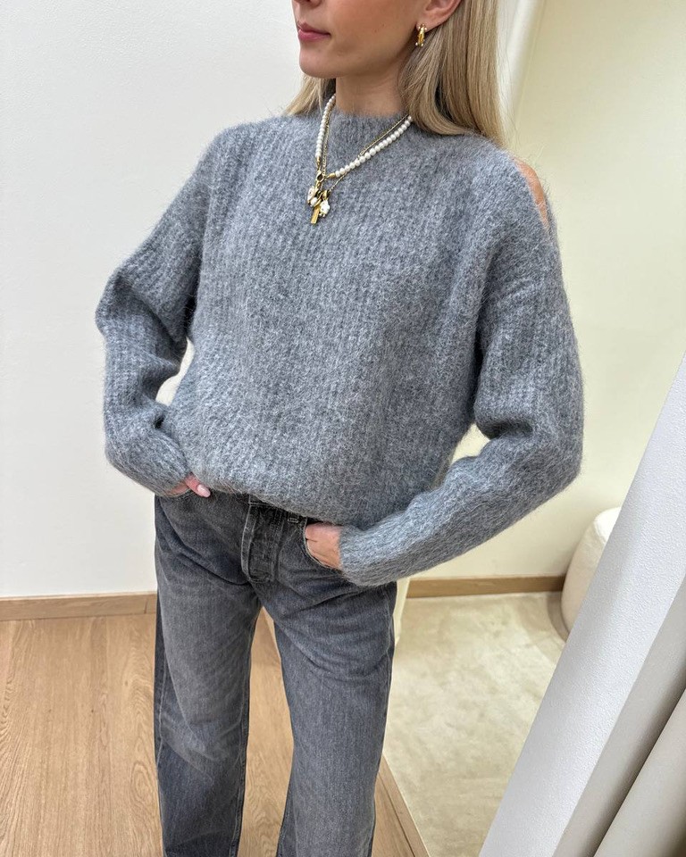 Maglione color grigio con alpaca, modello ampio, girocollo, maniche lunghe con cut out sulle spalle. Vestibilità ampia.