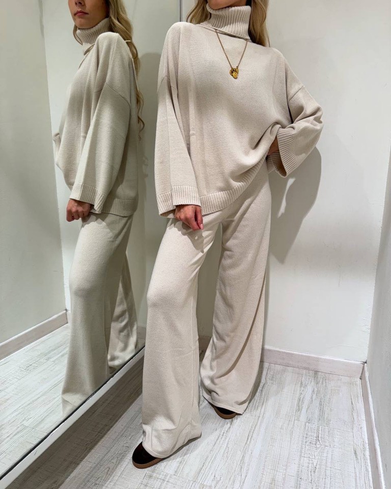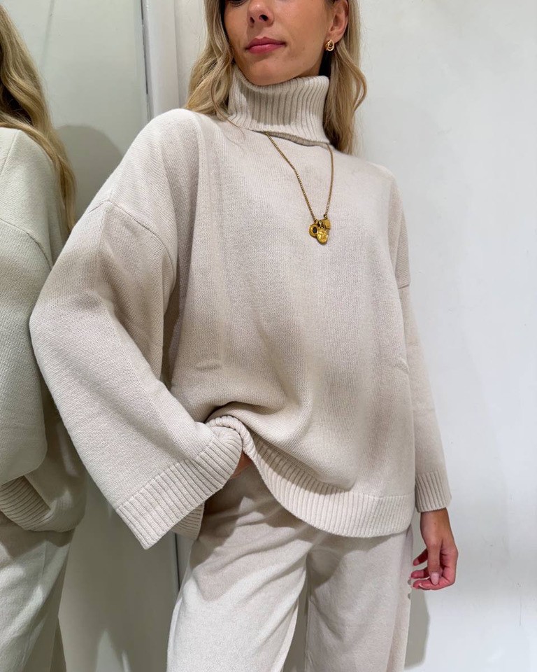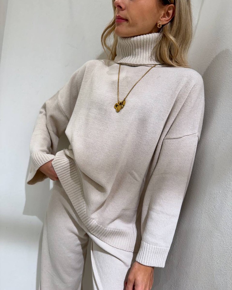 Maglione rasato color avorio in viscosa lana e cachemire, modello ampio, maniche lunghe scese e svasate, collo alto e profili a coste larghe. Vestibilità morbida.