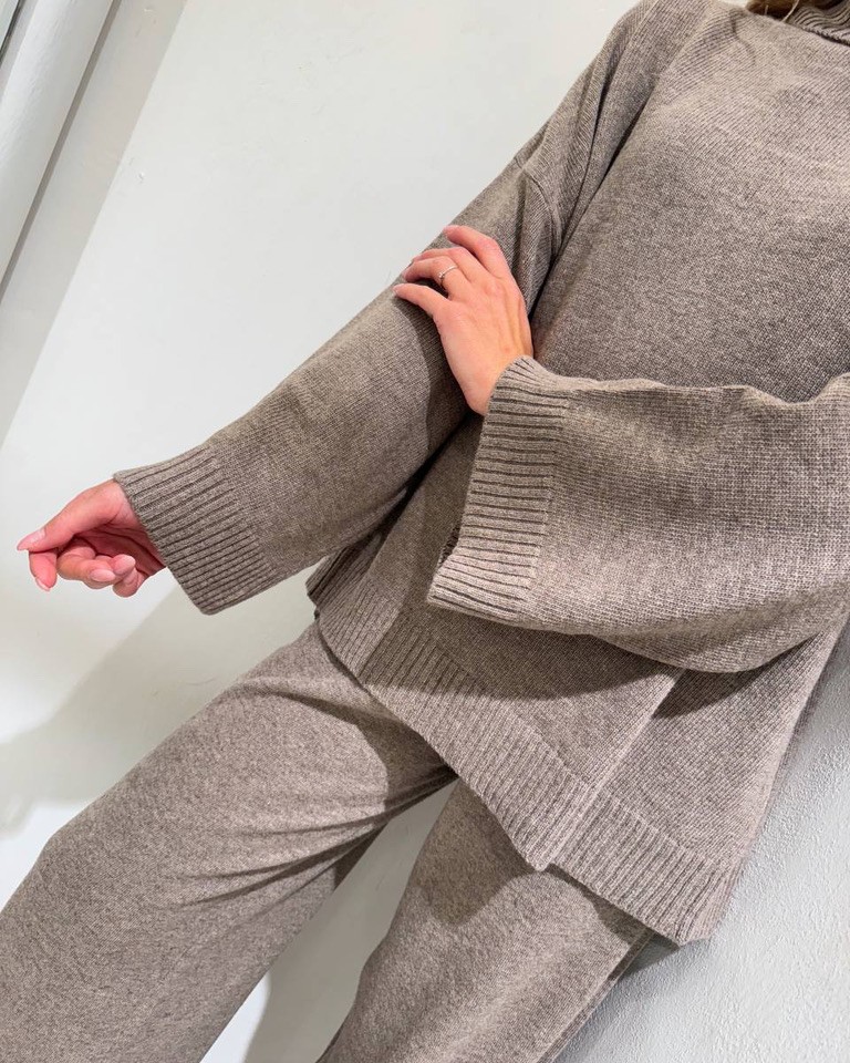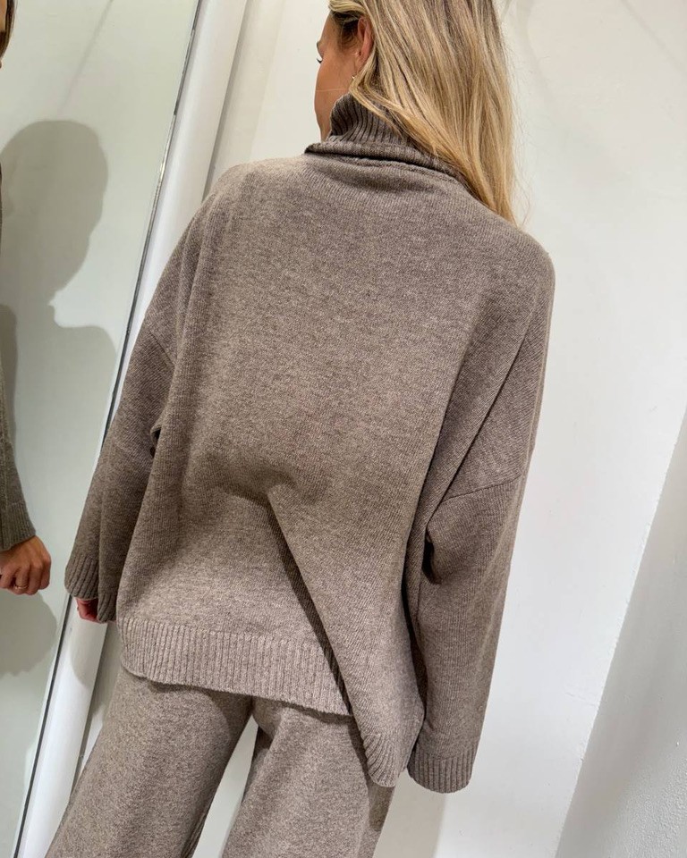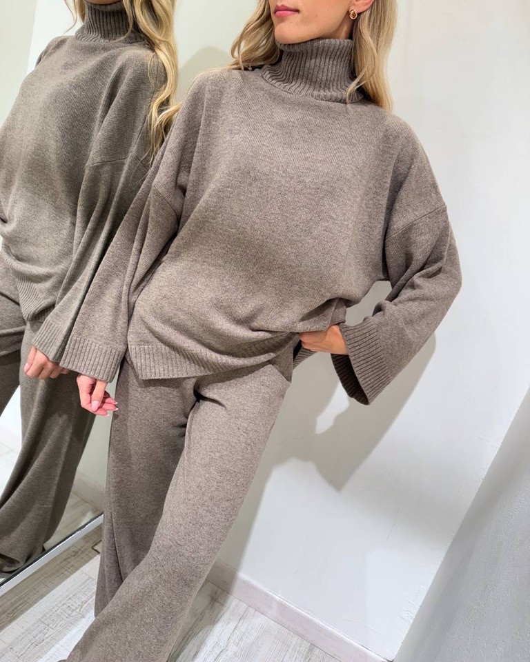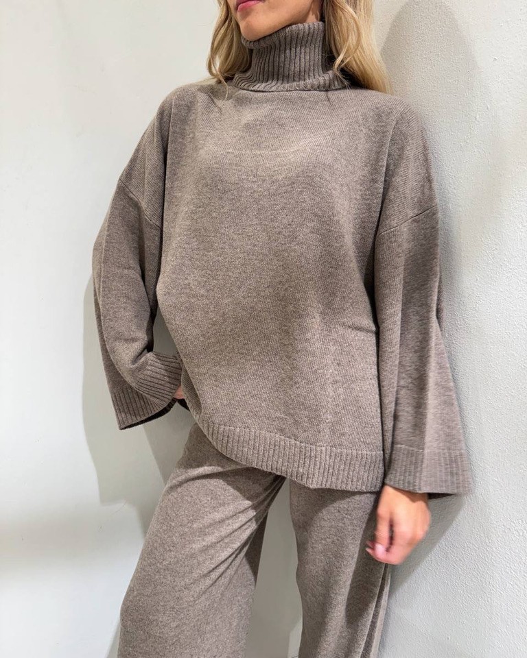 Maglione rasato color tortora in viscosa lana e cachemire, modello ampio, maniche lunghe scese e svasate, collo alto e profili a coste larghe. Vestibilità morbida.