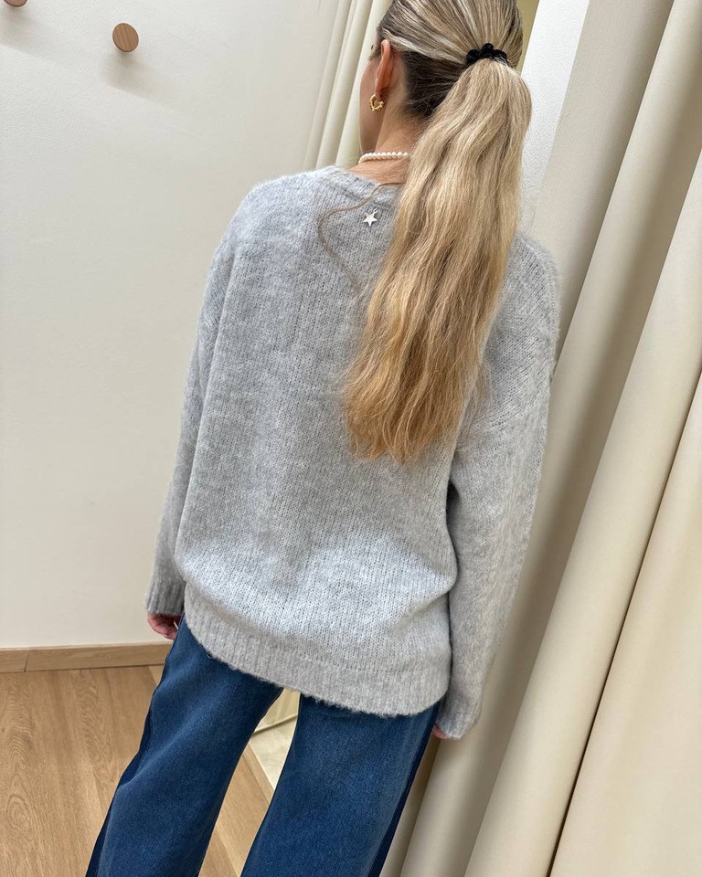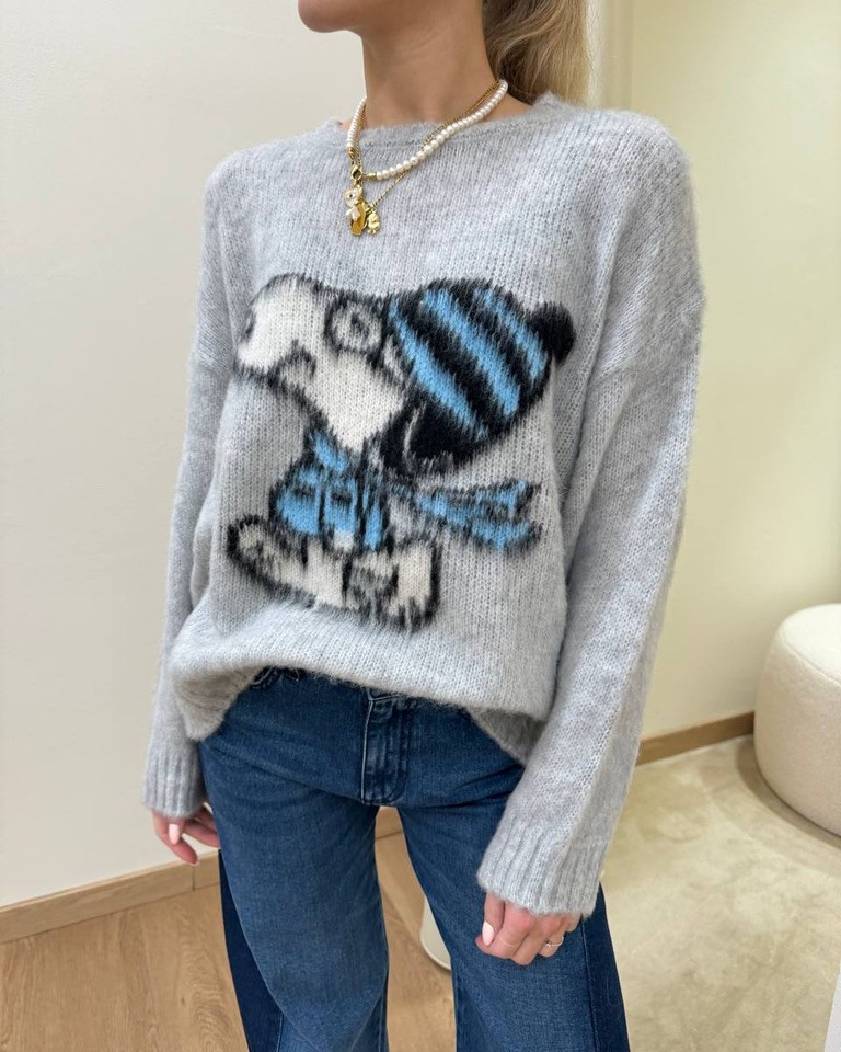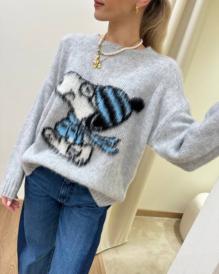 Maglione grigio con intarsio Snoopy celeste, con lana e viscosa. Modello over, girocollo, manica scesa, costine su polsi, fondo e collo. Vestibilità ampia.