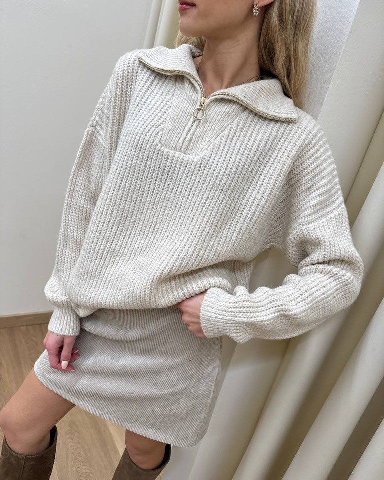 Maglione in maglia inglese burro con lurex, con lana e viscosa, modello maniche lunghe, colletto con chiusura zip ed elastico su polsi. Vestibilità morbida.