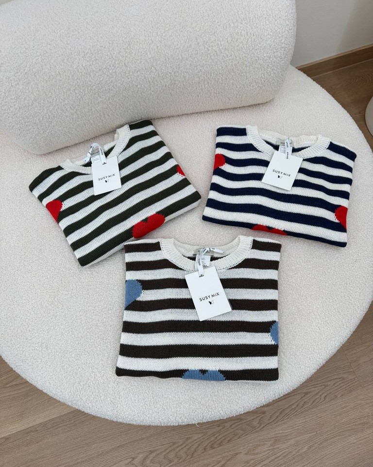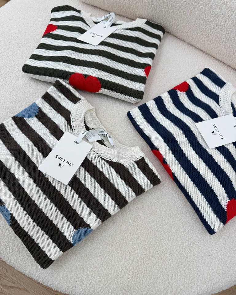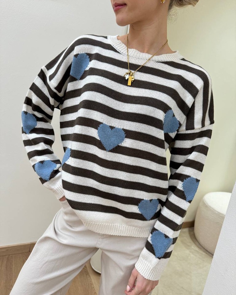 Maglione a righe panna e moro con cuori celeste polvere, modello oversize, a scatoletta girocollo, giro sceso e maniche lunghe. Vestibilità ampia.